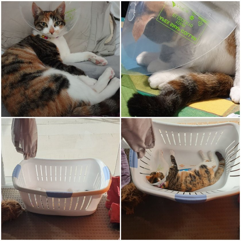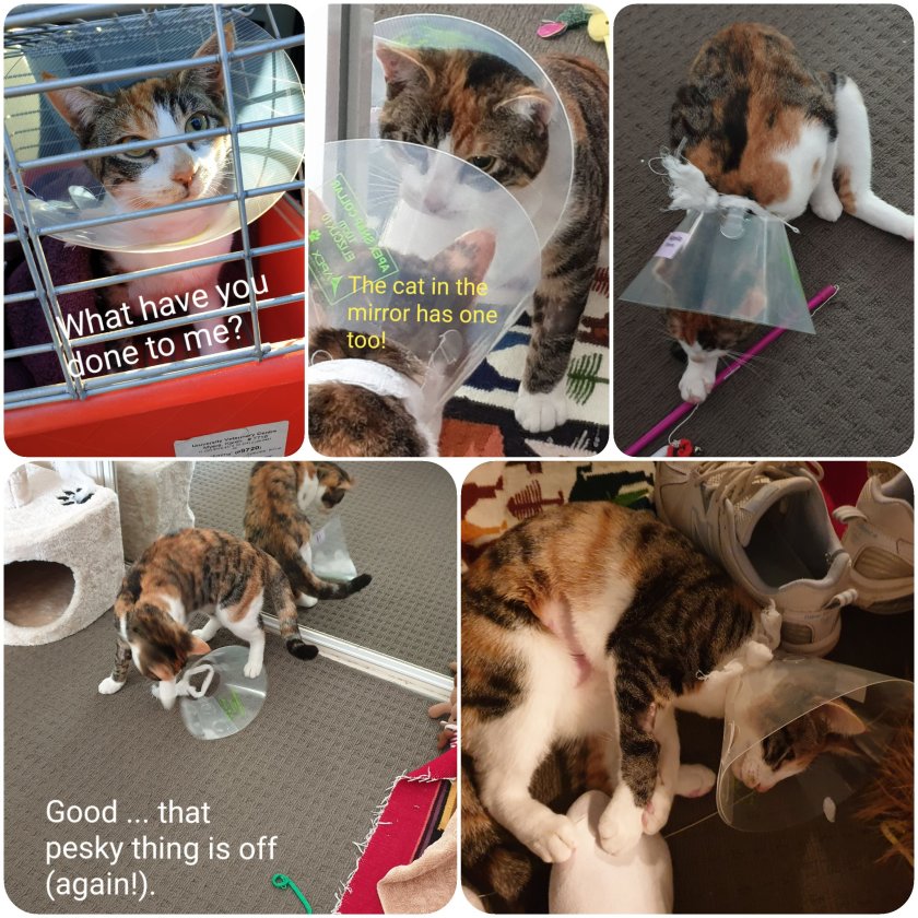 OMGoodness – what were Kaz and Sooz thinking? Who needs to be up and dressed and out of the house by 6:30am – it’s just not normal! And what was all that at the Vets… sure they were nice enough but I’m fairly sure they did something to me while I was there. If I could get this plastic cone off my head – and keep it off – I could have a proper look. I’m fairly sure they shaved my tummy and there are bits of plastic sewn into there as well. I’m not allowed to play with those… I know that for sure because Kaz and Sooz keep telling me not to. They get quite excited about it too. And about my running around the house – not easy with the cone on. Eating in it isn’t easy either. At least I can still sleep – except when I’m rampaging around at 3 in the morning (“No Nigella No”) and Sooz is trying to get that cone back on. Does she not realise how much effort it takes to get that thing off?