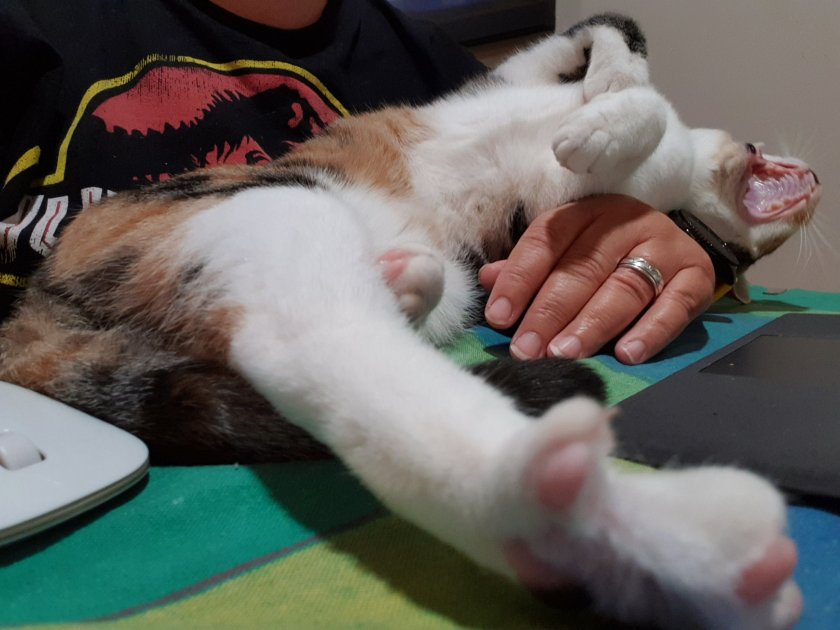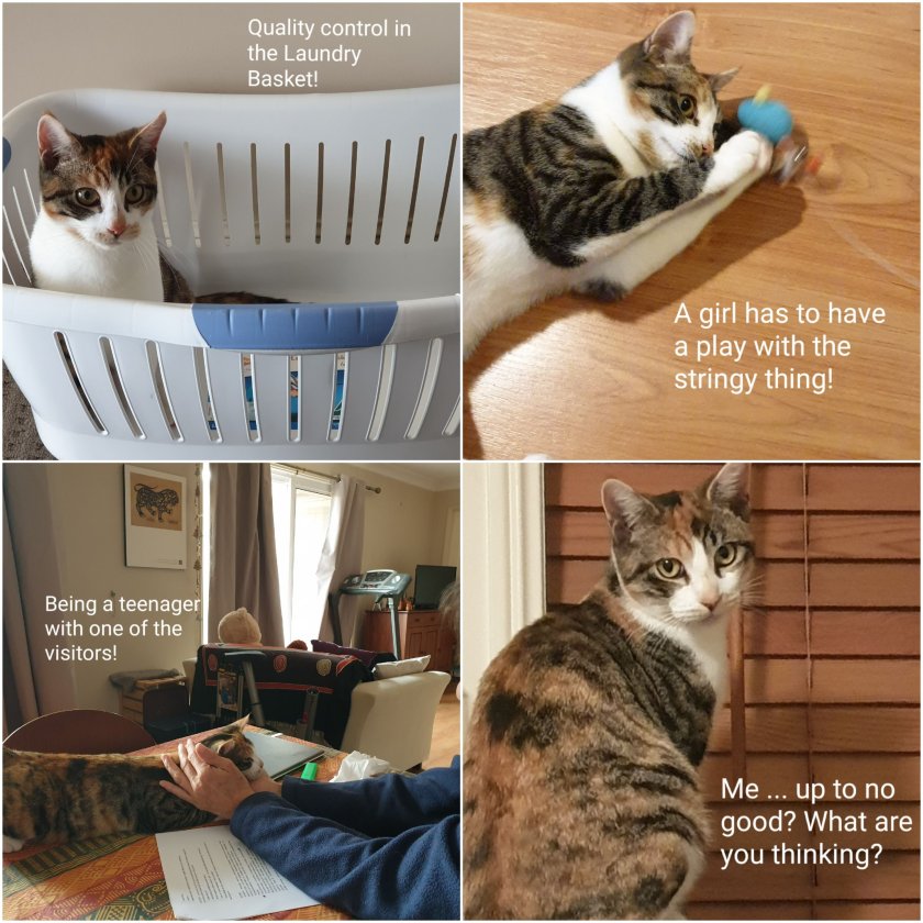 They keep wearing me out! Kaz keeps starting that game with the stringy thing – and that takes quite a lot of energy since she has me jumping over the bed and into the air over and over again. She keeps telling Sooz that she is going to set up the camera so she can photograph one of my leaps.