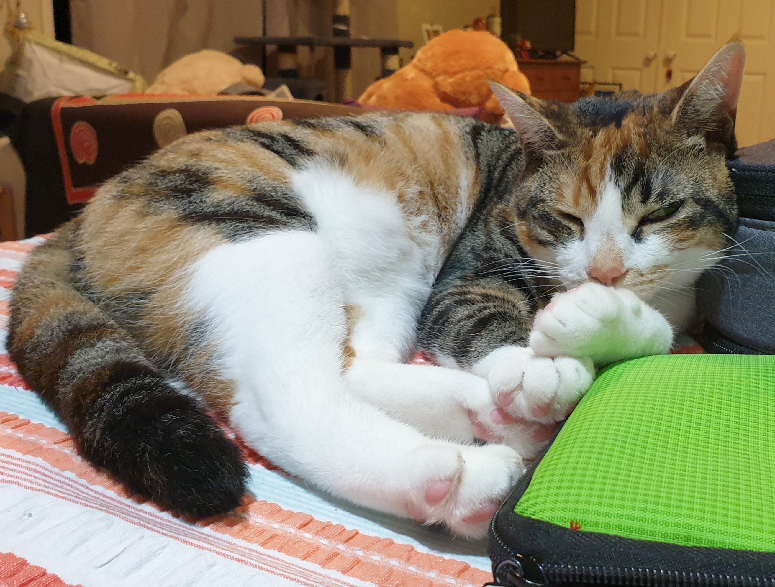 Apparently I am “a brute”! And just because I had a tiny little chew on the Stress Sumo. They (that would be Sooz and Kaz) know I don’t have hands so I can’t use it like normal people do. And I really didn’t think they would find it – not so quickly anyway. I hope this doesn’t mean Kaz is going to start sifting through my litter tray looking for evidence. As if it would have been anyone else – or could have been!I have been doing my best to keep Kaz and Sooz on their toes … especially when they’re not paying me (enough) attention-like when they’re doing the SMH quiz or the crossword. And Kaz certainly gives me a cross word (or two) when I hug her leg (really tightly) and give her a little smooch on the knee or calf. Just because I use my teeth sometimes she gets upset. Do you know she thinks she has to shake me off … well, that may be true – but it’s not like I would actually hurt her … and yes I have bitten Sooz on the bottom on occasion but that was an accident – more or less.They went out and left me locked in the laundry on Monday – not cool. But at least they left me with some of my stuff … including Pinkie. I think Kaz has only just realised how much Pinkie means to me … and it any took me having to take him through to give him some crunchies. So Kaz has it now … Pinkie is not a toy … he is my friend …who l have to carry around … because he is lazy … oh, wait, no … it’s because he’s legless … no wait, that’s not right either – it’s because he has no legs. Poor Pinkie. Lucky he’s got me.