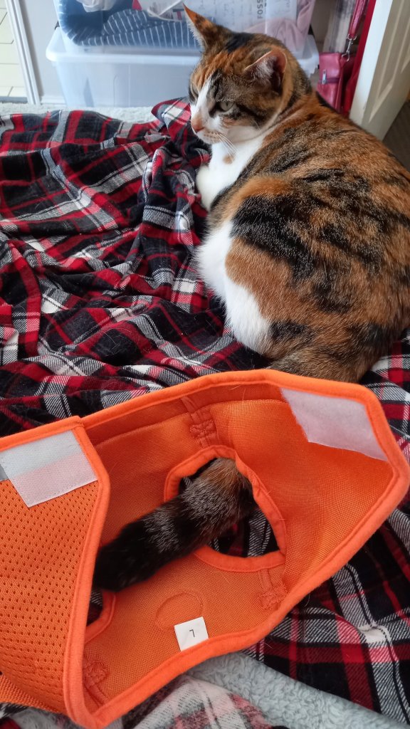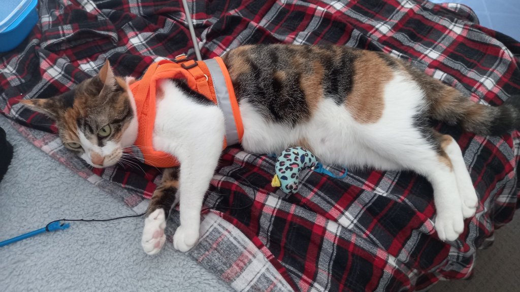It has been a busy week here. The harness keeps making an appearance – and Kaz has managed to get me into it again – and I managed to get out of it … again. She was last seen fiddling around with it – I think she’s tightening teh straps. Let’s see how long it is before she tries to get it on me again. I think we’re now at Me: 1.5 Kaz:0 Undecided: .05. I couldn’t believe it when she sent a photo of me and the harness to Aunty M … suggesting I had it on – but it was just that Kaz had put my tail in it while I was sleeping. Bad form!