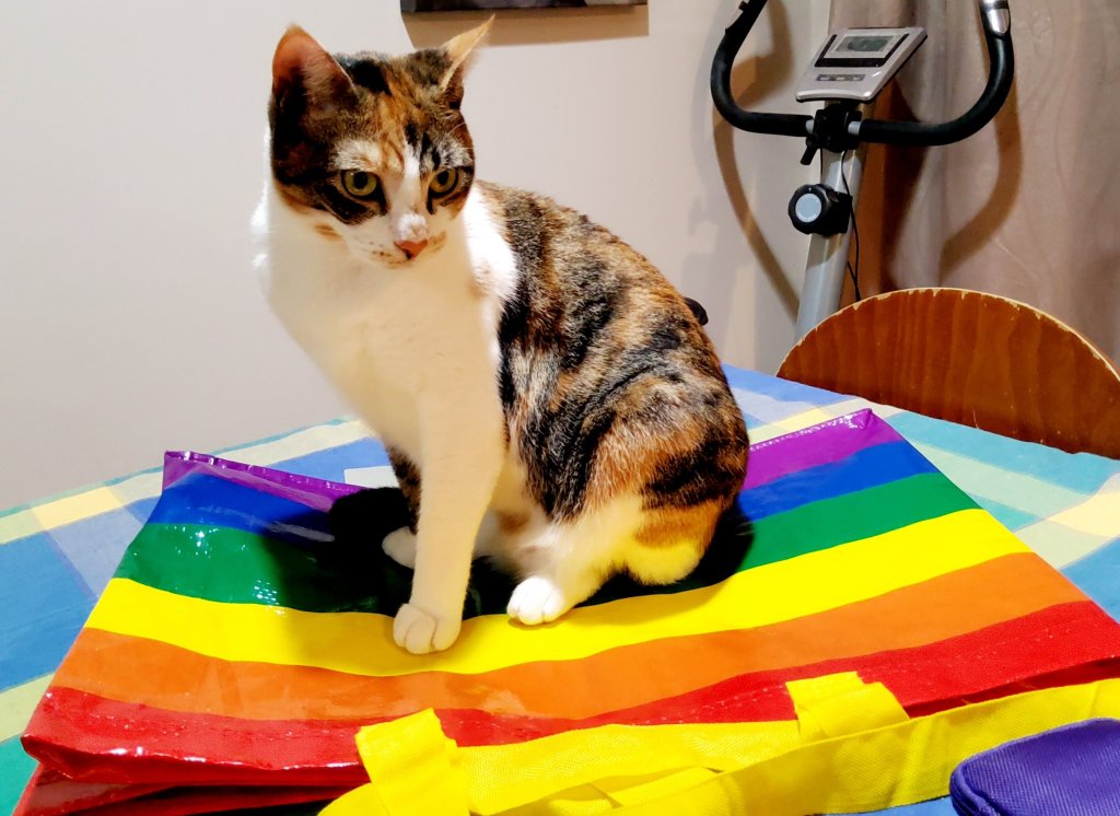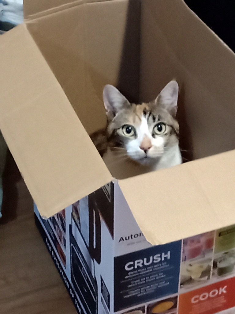 Not one to let me be, Kaz has been taking photos of me whenever I do anything … except abluting and eating that is. When I’m trying on the Coke box for size – there she is; when I’m asleep on the bed on the flannies – there she is; when I’m sitting on her computer station in the bedroom – there she is. But, she did bring me a new bag on Wednesday – that they were given by Aunty M’s cousin Mi [not to be confused with Aunty M’s cat MiMi). Kindness runs in that family!