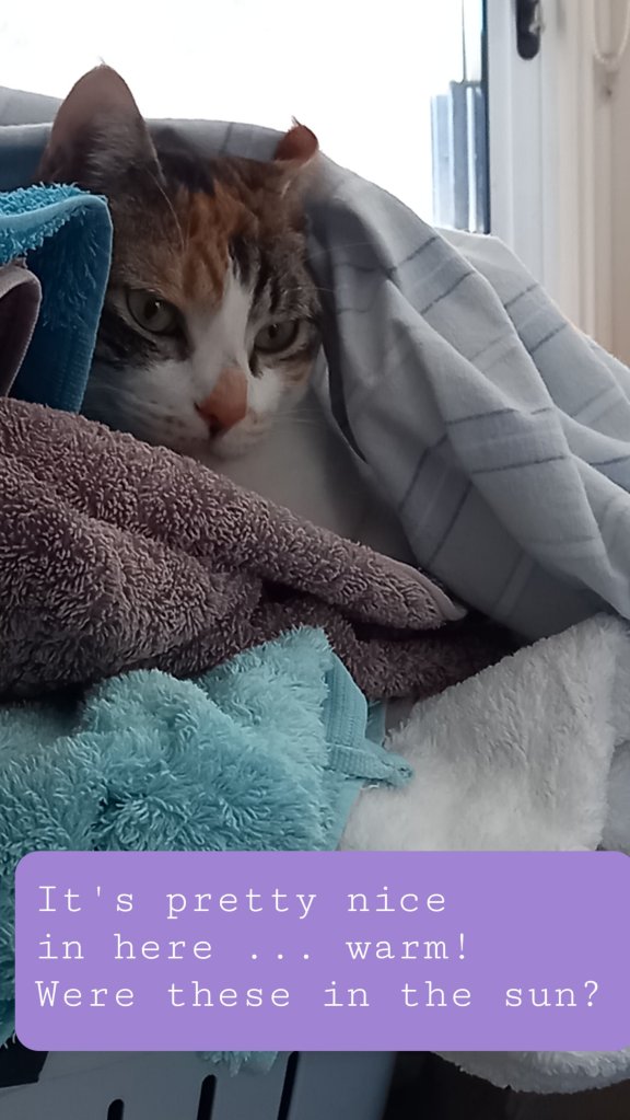 She still had time to sneak outside and bring in the rest of the washing while I was sleeping though. I’m glad she did because once she had it inside, Sooz folded it up … and then because Kaz couldn’t make it fit into the Manchester cupboard (I know she has plans for re-folding and re-arranging things in there), she popped the towels and sheets into Sooz’s “office” – and that was where she and Sooz found me later this evening (after they watched the Semi-Final of MasterChef … and yes, there may have been tears there!).