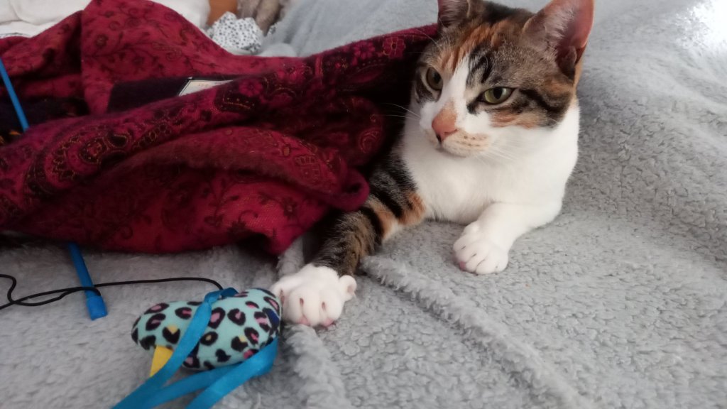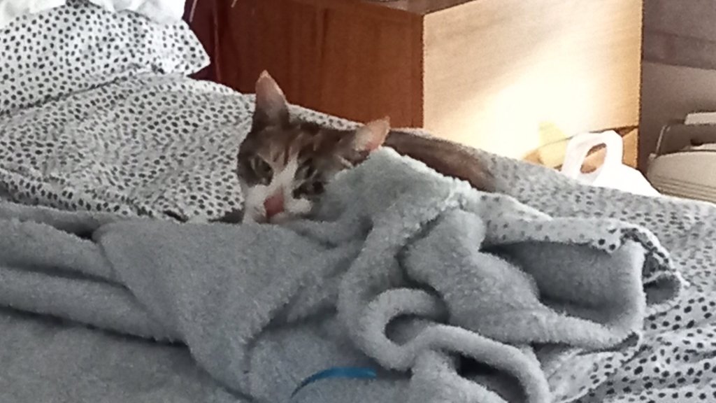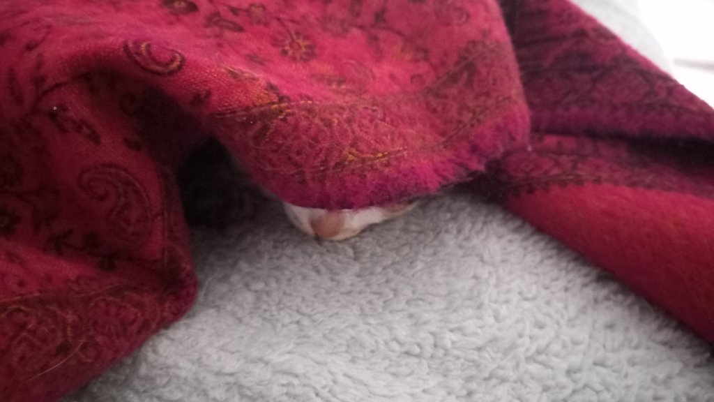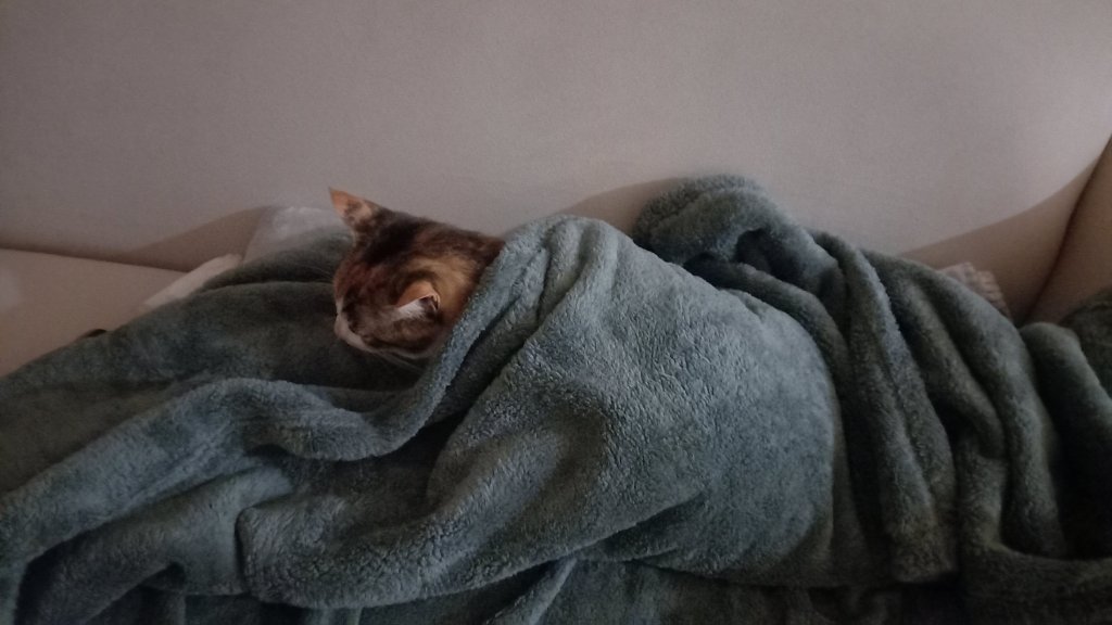 I was a bit tired last night though and I spent most of the evening curled up in Kaz’s arms at the table while she watched The Mentalist (he’s already taken care of Red John so it wasn’t too scary) and played one of her Casino games on her tablet. She called Sooz out to have a look at me at one point because she was concerned that there was something wrong with me – maybe a reaction to the vaccination – because I was … what was the word she used …. “quivering” – which is odd because I always thought that had something to do with arrows. When she went to bed she carried me to my bed on the couch (thank you Sooz!) and told me to let them know if I needed them during the night. I didn’t though and I must have had a good night’s sleep because the next thing I knew there alarms were going off and Kaz was coming out to feed me. Then, tummy full of yummy food, I joined Sooz on the bed for my morning nap … in Tibet … actually under Sooz’s shawl which has a label which says “Tibet”. I don’t know what it is about Kaz at the moment but she seems to be taking more photos of me than usual – especially when I’m trying to sleep … in Tibet – or anywhere really!