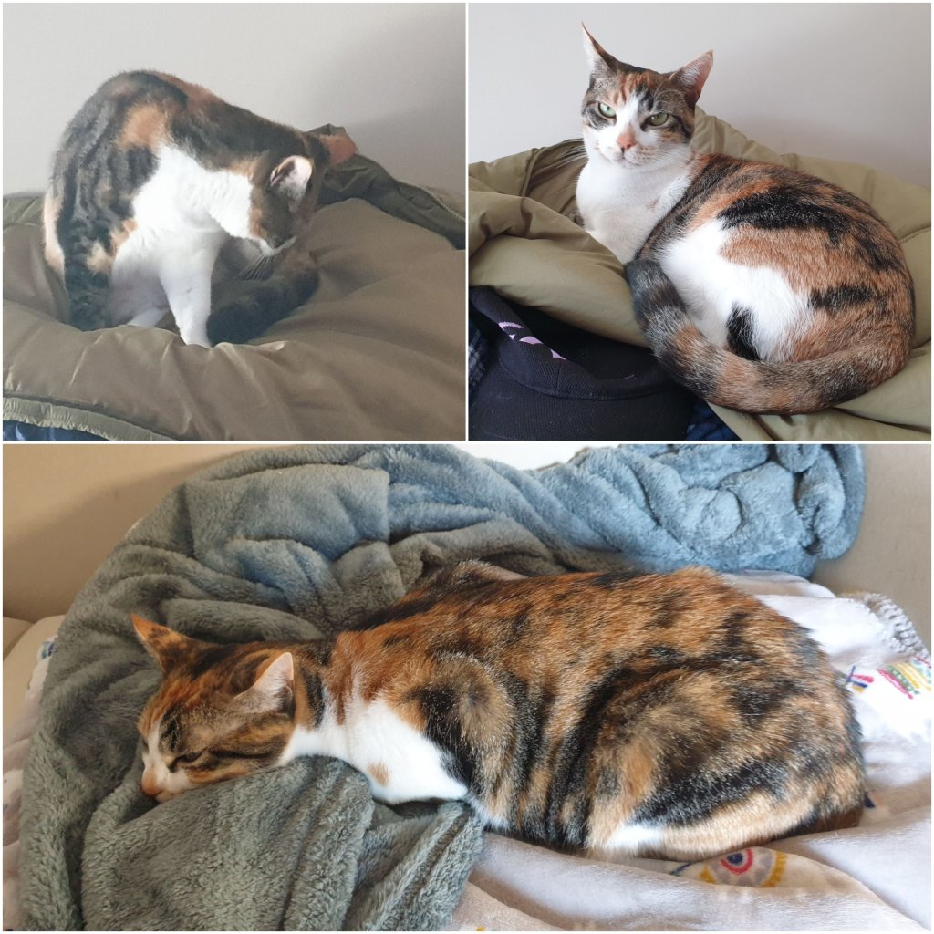 And then, here’s the cage again … I didn’t have to wonder what it meant for long because Kaz had scooped me up, put me in, and then held my head down as she lowered the trap door … oops, that would be the lid. She threw a towel over the whole thing and off we went … I think An was just coming in as we were leaving because there was some talking … but then Kaz and I were in the car and on our way … to the vet! It can never be anything nice can it … but at least I should be thankful that there was no temperature-taking this time (that can be a wee bit uncomfortable) – and I know my weight now – 5.35kg. So, I was there to be vaccinated (whatever that is … but I can tell you it does involve a jab with a needle) and having my claws clipped (try saying that 10 times quickly). It wasn’t totally unpleasant and I do have new food from the vet now … which is so yummy that when Kaz was getting me some out this morning and putting it on my bowl, I had to have some before she could even get it down off the bench. Mmmmm … scrumptious!