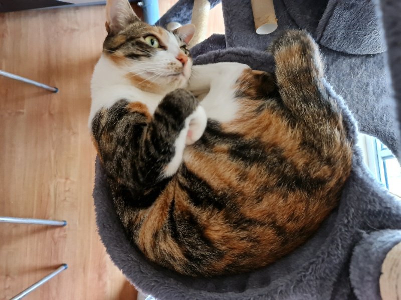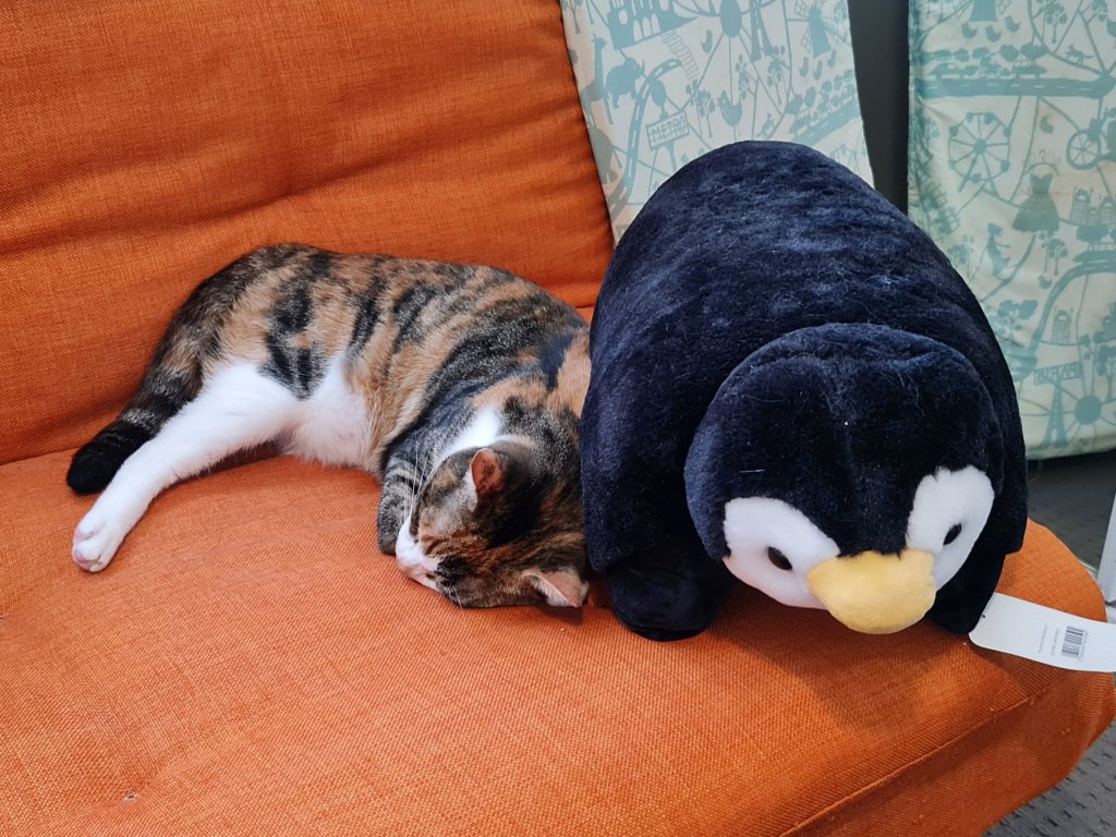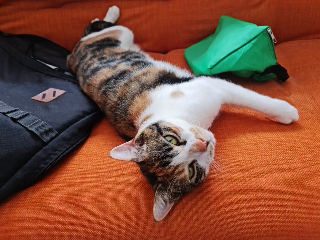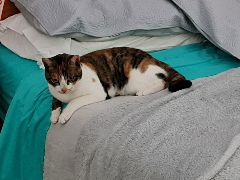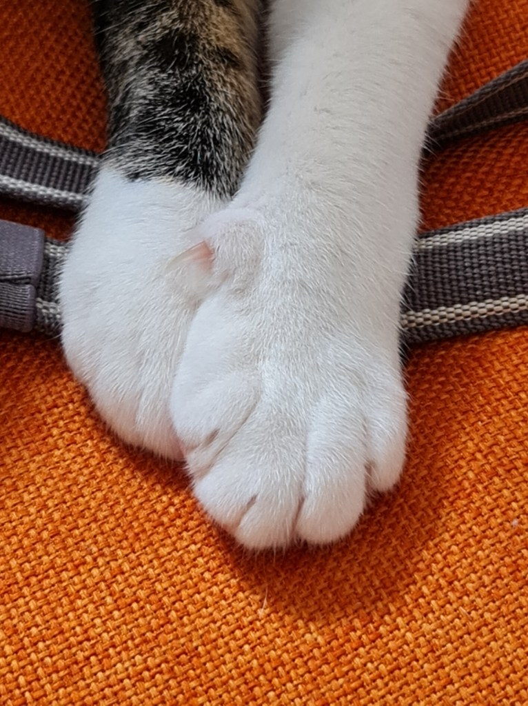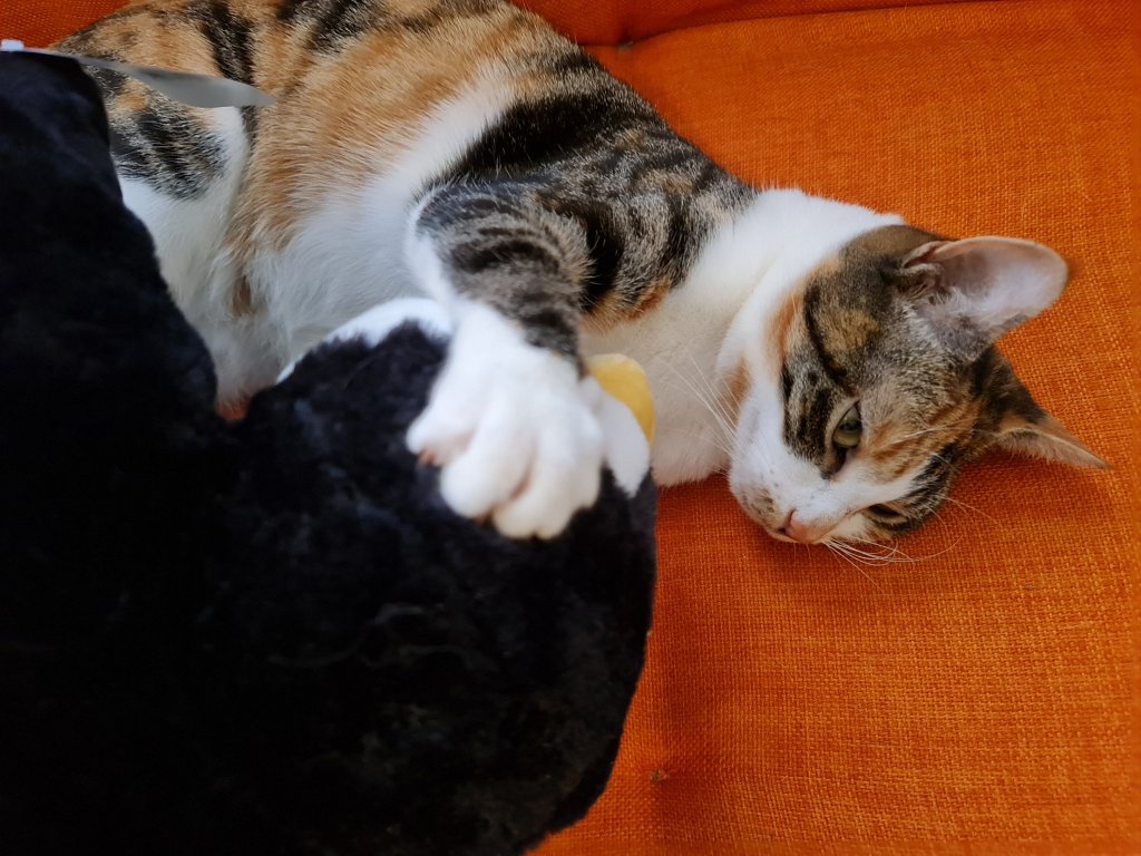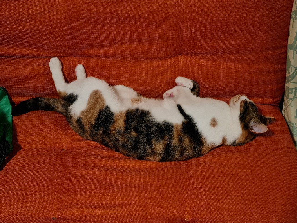 I can’t believe how much Sooz and Kaz talk about how hot it is … they’re right of course but neither of them wears a fur coat like mine. So rather than tell them how sad it is, I just make sure I am where they are while they’re home because they always have a fan or the air conditioning on. That’s why I’ve been spending a lot of time with Kaz in her office … while she’s sitting on her computer (heh heh – wouldn’t that be funny), I’m sitting – or reclining – on my pumpkin couch. I love it. And if she’s not there, or sometimes even if she is, I go in to keep Sooz company in the bedroom. She reads in there and she’s also doing “Queer Eyes” at the iPad at the moment … and a lot of it. Otherwise, things are normal here. They’re feeding me … and when they’re not feeding me enough, I have a bit of a chew on Kaz’s leg.