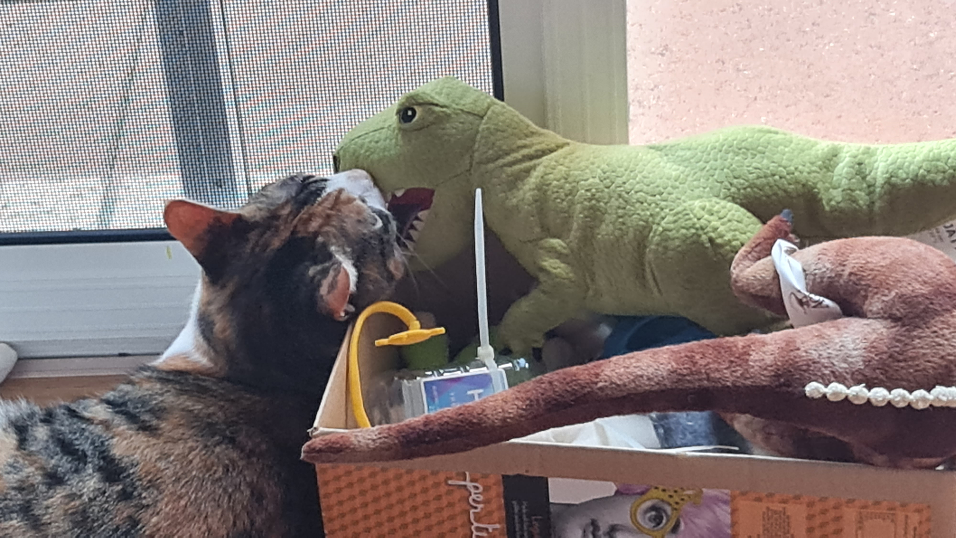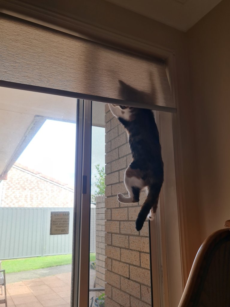 What to do? What to do? My current project is trying to get outside. This is going to take some planning and a lot of deviousness and pure outright cunning on my part … because while everyone might think Kaz is a pushover, she is not … she is insisting that the only way I am going to get outside is if I am wearing that bl**dy harness (like she even has any ideas where it is) … and we all know that ain’t happening. So … I watch and I wait and test the boundaries … and continue to be amazed that even when Kaz has both hands full of stuff and somehow just manages to get the screen door and the front door open, she can still do this little dance with her feet that stops me getting out. And who knew she could dance? And no, we’re not saying she dances well, just that she can. I’ll keep you posted.
