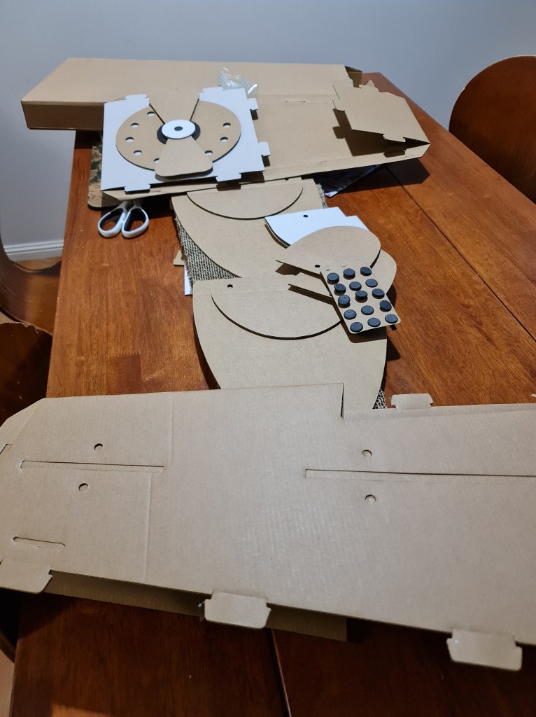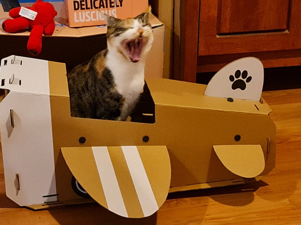Was it my care, concern and compassion that led Kaz to get me a new little something for my toybox during the week? I don’t mean to sound ungrateful but maybe I could have tried harder! That way I might have gotten a billiard table like (my ArchNemesis) Mimi rather than a cardboard plane! Mind you, I’m not quite sure where we could fit a billiard table here – unless it was on the back deck but that wouldn’t work because they still haven’t had it enclosed – and no I don’t care how much the new hot water system cost Kaz, it’s not something I use – and if the deck isn’t enclosed, we all know I’m not allowed out there!