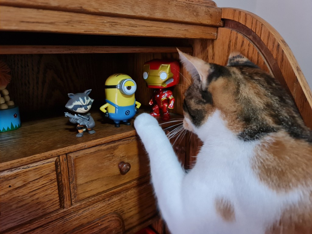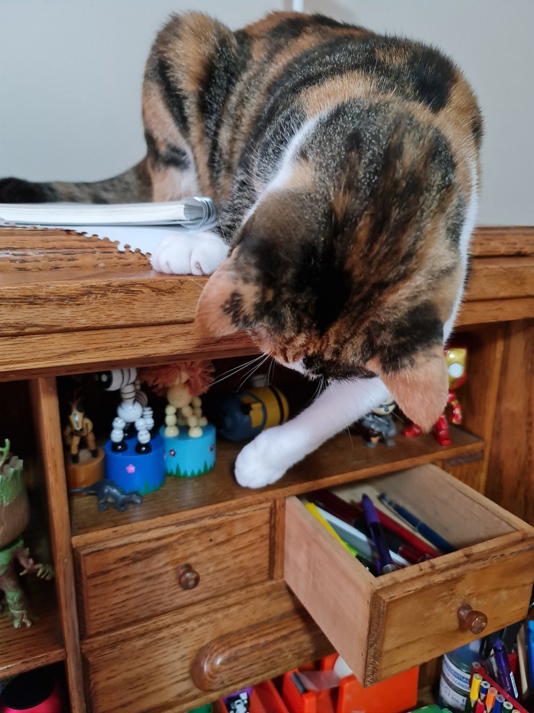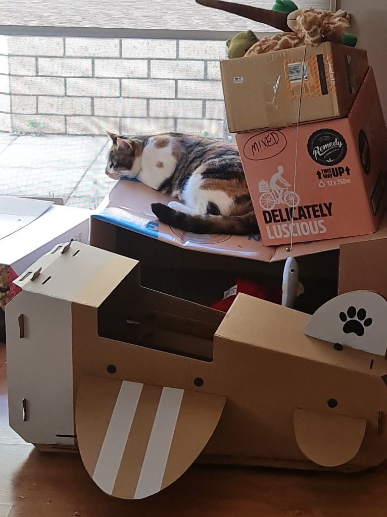 I am enjoying the scratchpad in my airplane. It’s all good except I have to sit backwards in it because the back of the plane is too low for me to sit frontwards. Sidewards works too though – although it’s a tad awkward. If only Kaz would fix my caravan – or at least cut holes into one of my other cardboard boxes like Aunty M did for Mimi so I have doors and windows to go through again. But at least she lets me spend time on the top of Ollie Tedesco even though she knows that I’ll probably reach down and grab one of her toys. I really like the lion.