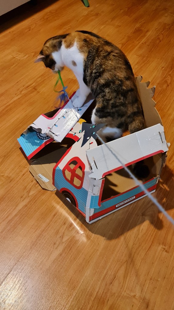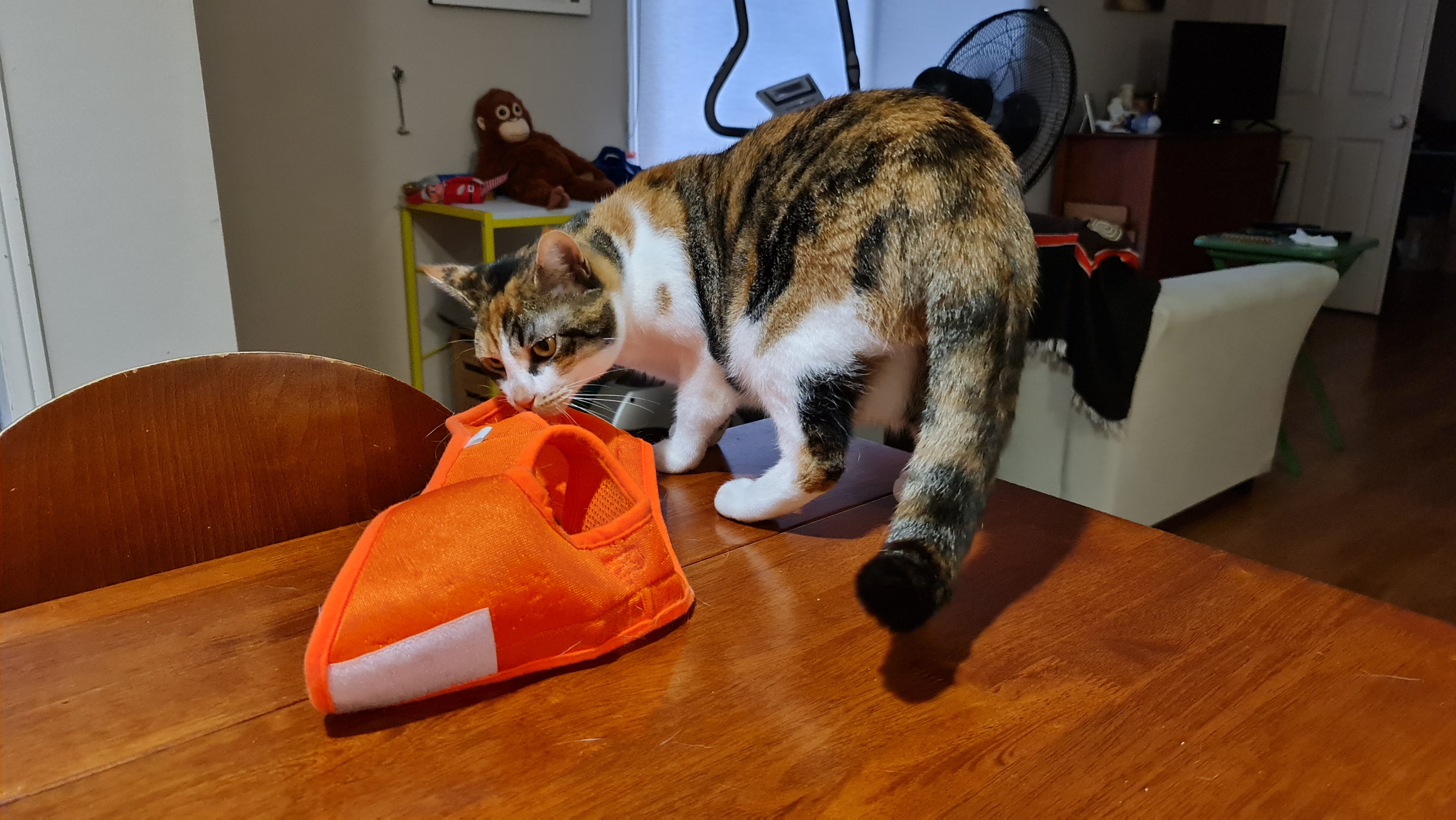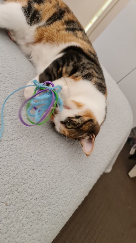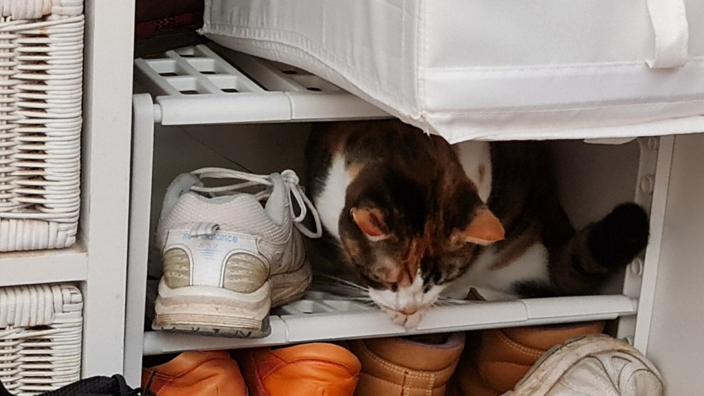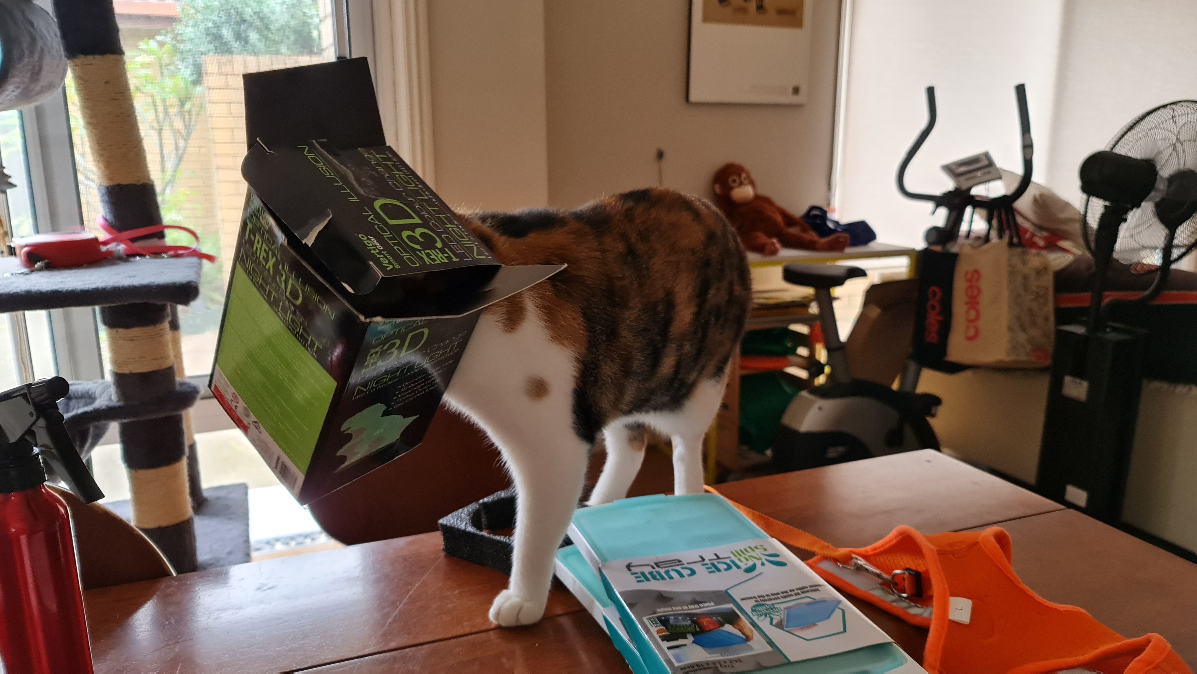 Lock me out of the bedroom will they? Well, first they have to catch me. Yes, that’s right, the Mummies thought they were smarter than I am, but they are wrong. All I have to do is get under the bed and they have no way of getting me out … except with ruses, subterfuge, chicanery and down-right trickery … yes, that’s you we’re talking about Kaz. I’m surprised they hadn’t twigged sooner … while they’re out watching television now, when I know it’s almost time for them to take over the bedroom again, I just put myself under the bed … and sometimes they don’t even know that I’m there … and they go looking around the house for me … so they can make sure I am on the “other side of the door” when they shut it. I decided, though, that that isn’t fun enough so now I wait until Kaz starts bringing her things into the bedroom (yes, we know there are too many electronics living in the bedroom as it is, but they won’t be told!) and then, when I’m sure she’s seen me – I’m usually just hanging out at the en suite door, half on the tiles, half on the carpet – I just slip under the bed, making sure to leave my tail out so she really can’t miss it. Once I know she has seen me – she usually says a swear word because she’s worked out what’s happening – I just go all the way under. And stay there … and stay there … and stay there a little longer. Of course, they pretend not to notice and go about their usual stuff … the Sydney Morning Herald Trivia questions or name that tune or talking (they really don’t have that big a repertoire) and I just wait and listen and take a little nap … until I hear the thwap thwap thwap of the stringey thing hitting the floor on either side of the bed, and on the bed, and in and around the box near the bed. Kaz thinks she can lure me out with it … I think she calls it “catfishing” … she really has no idea of modern language – although I suppose it is a little like “the process of luring someone into a relationship by means of a fictional online persona” except she’s pretending to be someone who wants to have a stringey-thing game with me. To be fair though she actually does appear to be a softie because last night when I finally came out from under the bed, she actually did start having a proper game of stringey-thing with me rather than scooping me up and taking me outside. Sucked in! When it looked as though she’d had enough of the game, I put myself under the bed again. Thwap. Thwap. Thwap. If I hadn’t been distracted by them talking about the helicopter doing low passes over the neighbourhood I’d probaby (read: definitely) still be under the bed but I forgot just for a moment and this time Kaz did scoop me up and pop me out to the living room (before walking very quickly back to the bedroom to close the door because she knows I can run faster than she can!).