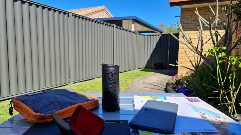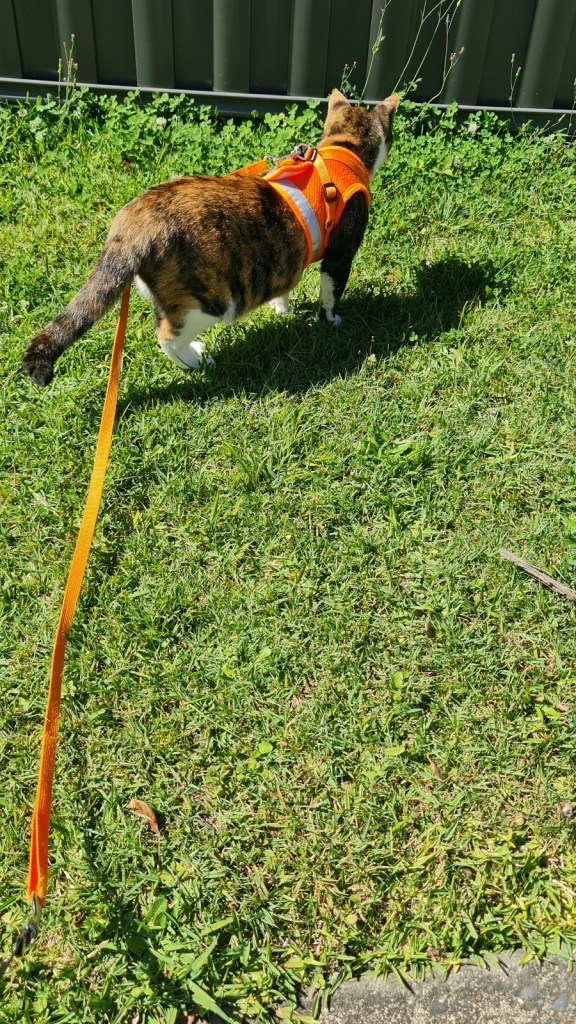 We did go out the other day for a while; and we went out again today. It was a bit traumatic though, yesterday and today, when Kaz went out there without me. It was like she was having a picnic – she was out there with a table and chair … and her computer and she stayed out there for yonks. I tried to attract her attention while she was out there but she ignored me and wouldn’t let me come out to keep her company.