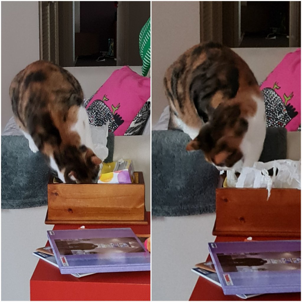 But the good thing is – because there’s always an up side right? – is that Kaz has been taking photographs of me again. A few of them too. Now, this may or may not be true but I think she’s just following me around waiting for me to do stuff. Take today – Kaz practically told me to go and play with the tissues – don’t get me wrong, I was happy to do it for her – but really, doesn’t she know I need boundaries.