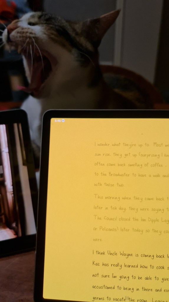 I wonder what they’re up to. Most mornings those Mummies have their alarms sound just after sun rise, they get up (surprising I know) and then they go off somewhere in the car. They often come back smelling of coffee … and Pelicans! Can you believe that? I think they’re going off to the Broadwater to have a walk and a coffee or maybe just a coffee … or they could be going somewhere else completely … you never can tell with those two.
