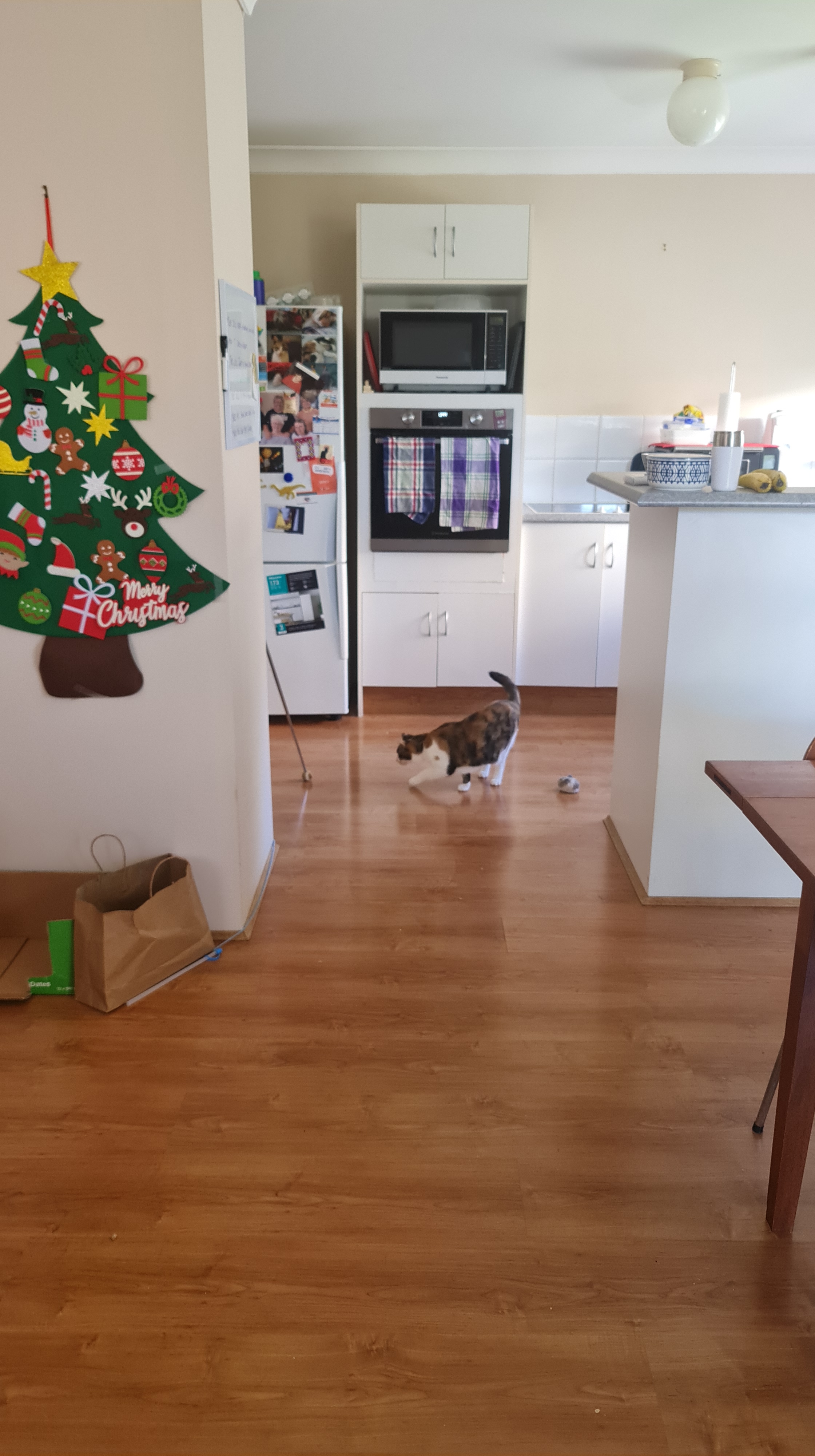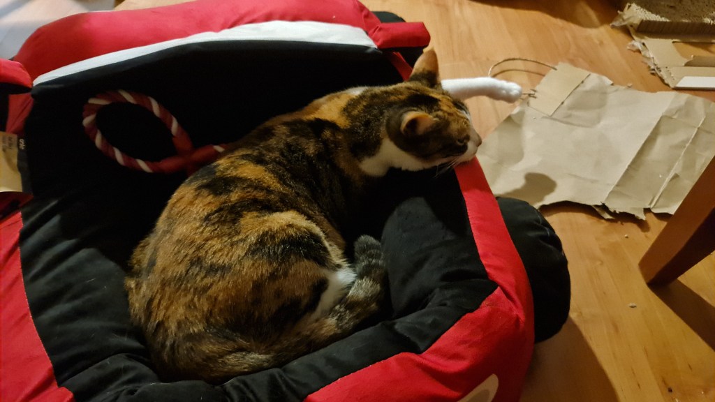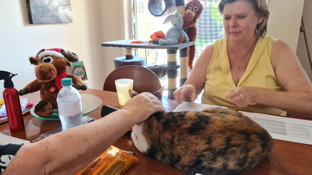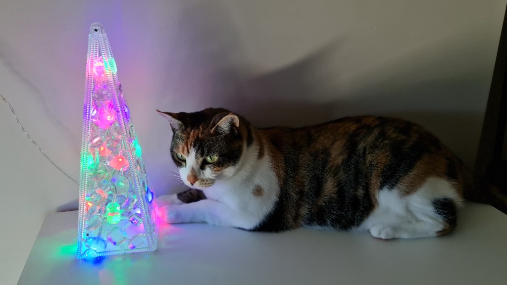 Sooz and Kaz went over to visit Mimi the other day. She’s a lucky cat too … she gets her own Christmas Tree and Christmas Cracker. It’s just a shame she doesn’t seem happier. I have heard that some cats are more highly-strung (oops, what a bad choice of words!) than others – but I don’t think this is what it is with Mimi … she just looks so worried! It might have been because her mother (my Aunty M) was off to have something done at the Hospital … it turned out to be nothing really but I can understand how Mimi would have been worried about her.