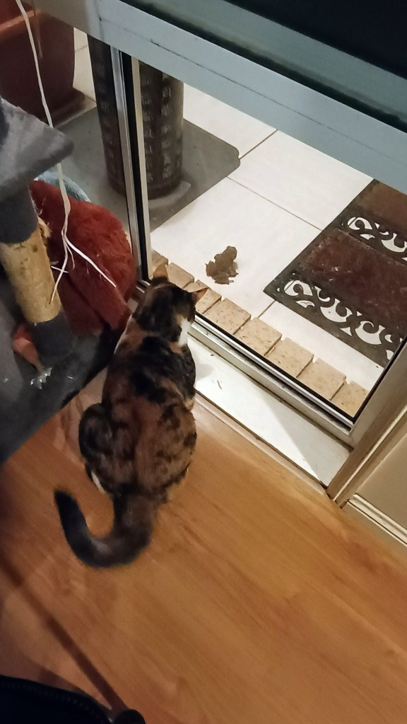 It continues to rain here and it’s a bit like a wildlife habitat out the front. Not only do we have our own Lennie now – just a bit smaller than the next-door’s Lennie – but we also have a gigantic Kermit (a toad not a frog though). I think M Kaz was a bit afraid to go out there with him this evening – certainly she ran past Kermie as she went to the freezer in the shed to rescue their dinners (yes, yes, M Kaz says she is going to clear out the “house freezer”) and she kept a close eye on him as she righted the lemon tree, which had fallen over a little bit again. She was going to put it back in its big pot but she couldn’t because that’s where Lennie’s living. I can’t wait until I can go outside and play with them.
