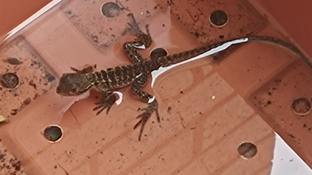 It’s still raining and I know that because I went out in it today. The Mummies weren’t planning to take me out but while they were fumbling with the shopping and the front door, I made a break for it … and I made it too – out onto the stoop, then through the water puddled on the path, onto the grass with ground sodden underfoot, with quite large drops of water hurling themselves down out of the sky at me. It didn’t take me long to swing around and race back inside … just as M Kaz was swearing her way out to come and get me. I wasn’t out there that long so I didn’t see Lennie but M Sooz had … on her way in. He was in the lemon tree pot and it looked like he was more than knee-deep in water. M Sooz was worried about him, and once I was back inside (and patted dry with a towel) M Kaz went out to check on him. He was okay but she didn’t want to risk him not being able to get out of the pot as the water rose – as it surely would with the continuing rain, so she lifted the pot so the water drained out and then she put it on its side so Lennie could have a quiet wander, stay in the pot or go and sit in the base which still had water in it. He seemed appreciative. There was no sign of Kermie though.