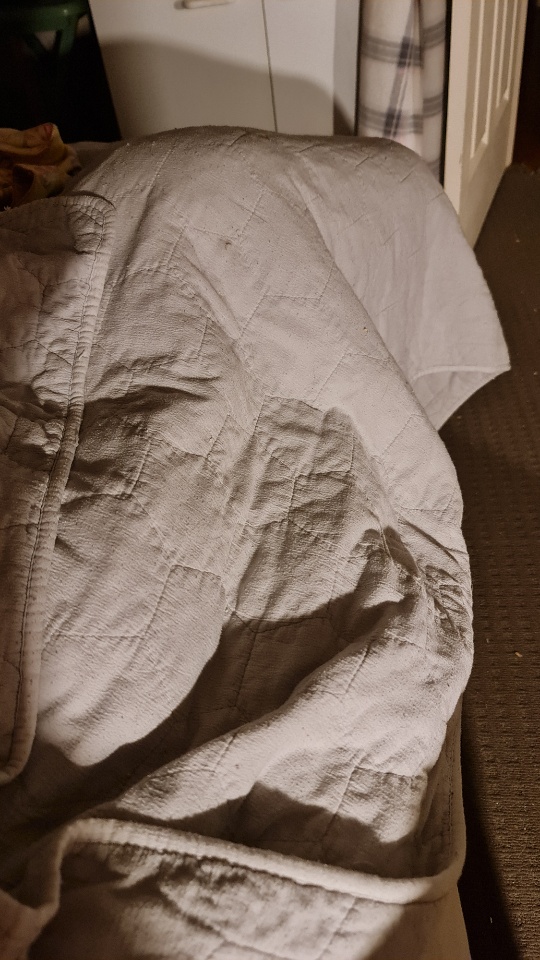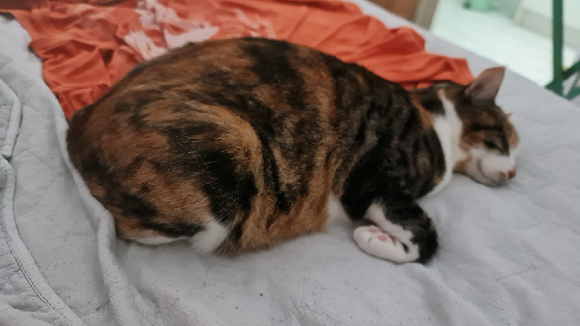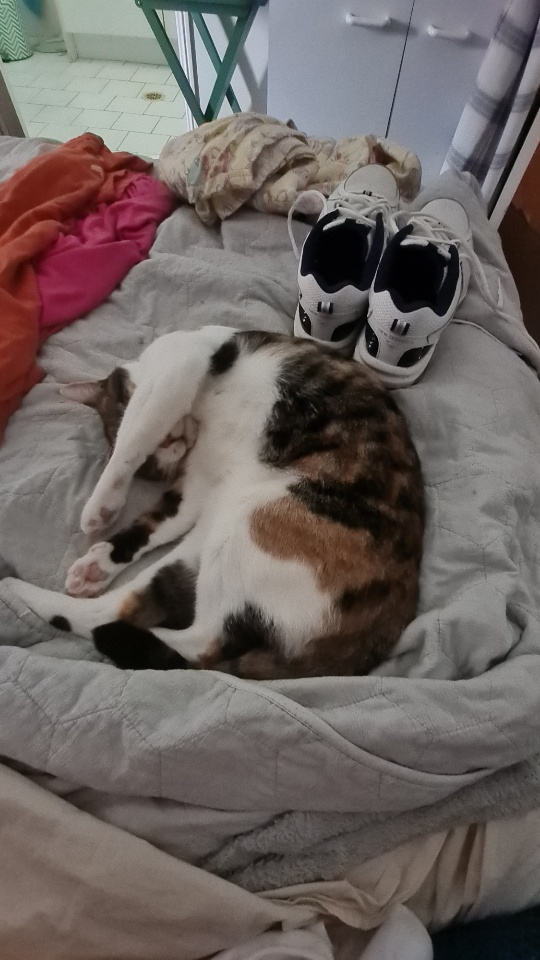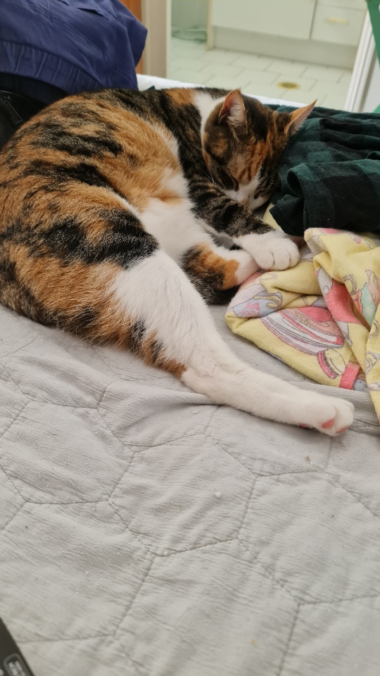 Since it is raining and because M Kaz is not yet fully recovered from the CoVid, we are spending a bit of time in the bedroom and M Sooz has made the best bed for me out of one of the new stackable washing baskets and her new big thick winter coat. It is so warm and cozy that I don’t have to be on the bed with them all the time. I do get a bit hot in it sometimes and I go and lie in my cubbyhole at the windows to cool down.
