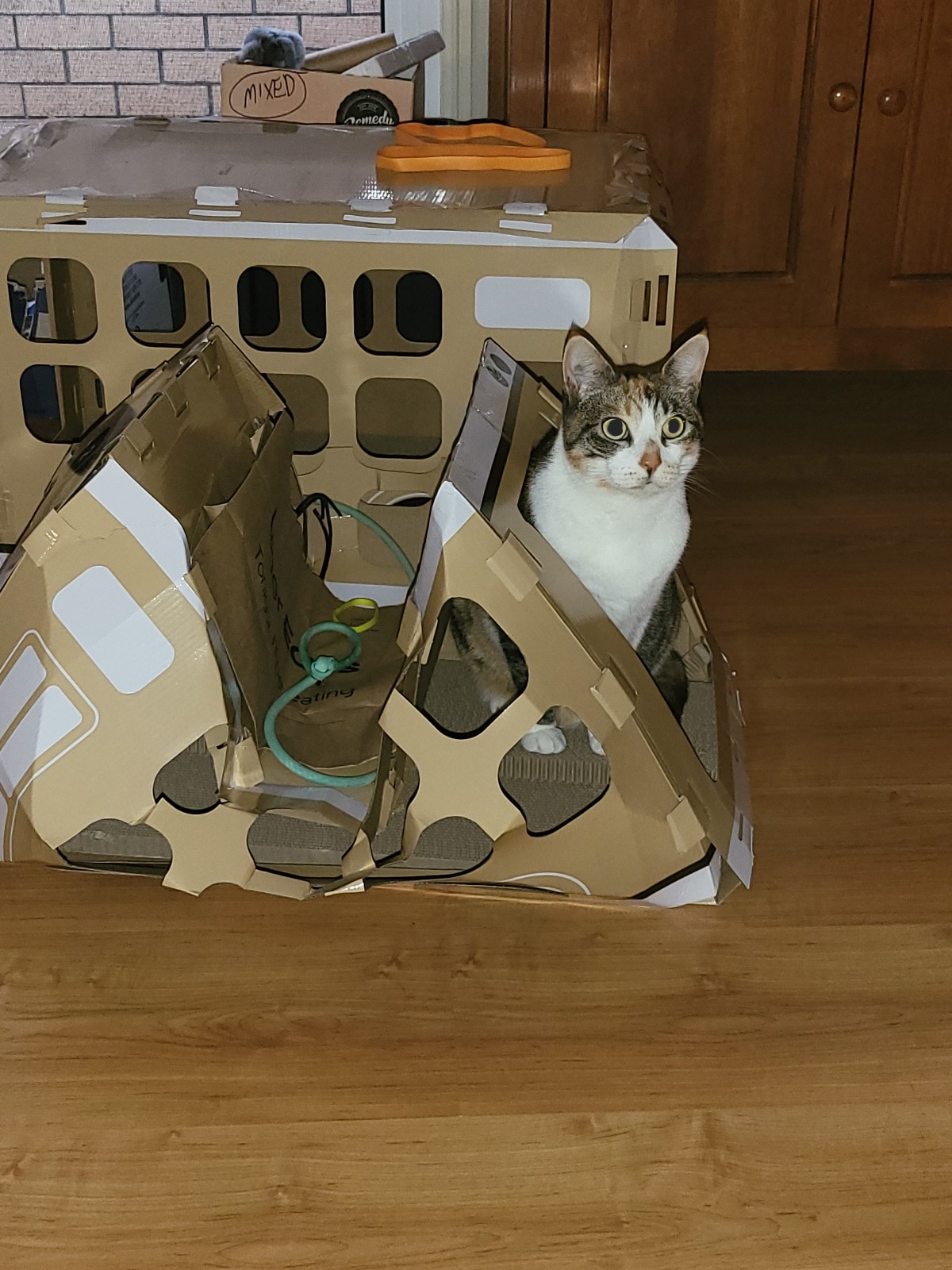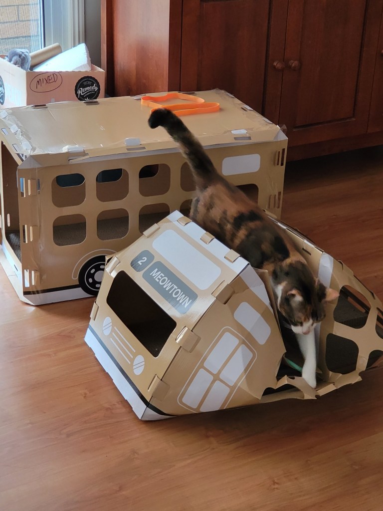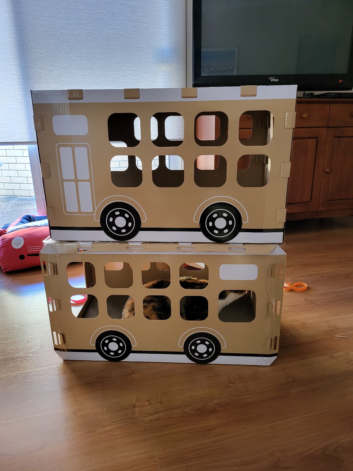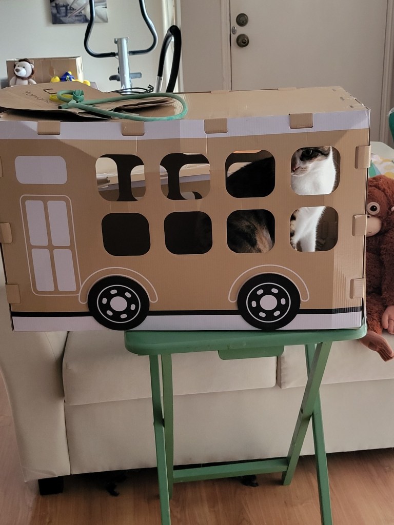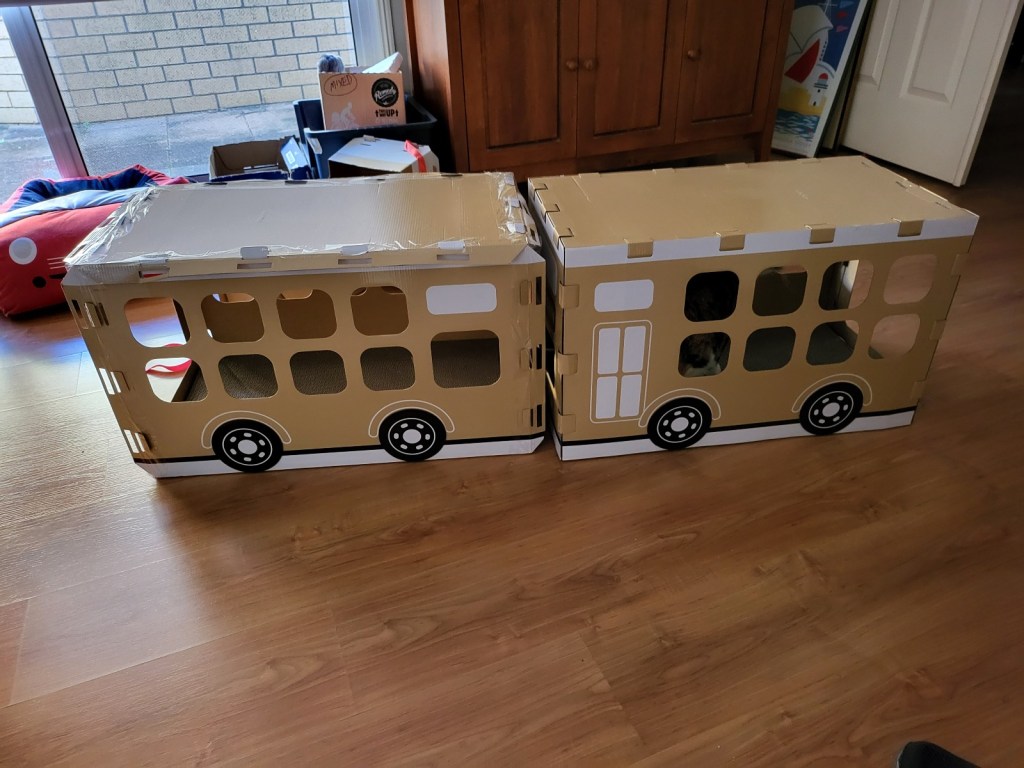 It’s not very nice when you crow M Kaz. Aunty A came today to help them with their cleaning and while she was here the Mummies were telling Aunty A about the buses – and why it is that we have two – one a little prettier than the other. If you remember, that was the one that Elly (the KMart shopper-lady) put together … and then her cat didn’t like it, so M Kaz bought it from her. All the while M Kaz was saying that Elly’s might look pretty but because she knows I like to sit on the roof of my vehicles – or caravans, or beach houses – she said she had reinforced the entire bus with tape so it would still be standing after I’d been sitting. And we found out today that she was right! The pretty bus roof collapsed while I was on it … it was lucky I didn’t get injured. Of course, you know what M Kaz did as soon as she saw what had happened … no, it wasn’t to rush over to help me out (I was a bit wedged in there) … she went to get her phone so she could take a photo! I know M Sooz would have rushed over to help me … and she was going to but M Kaz asked her not to until after she had taken the photo! I’m glad she did because it does show the danger of form over content! We should all learn to trust M Kaz a little more … says M Kaz!