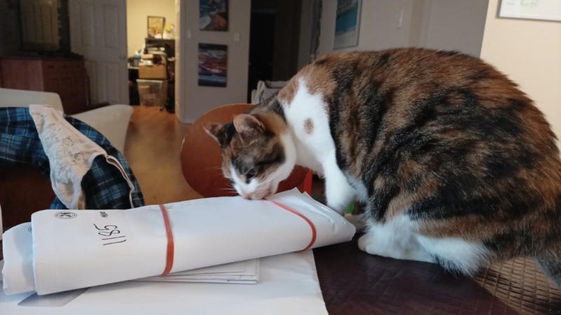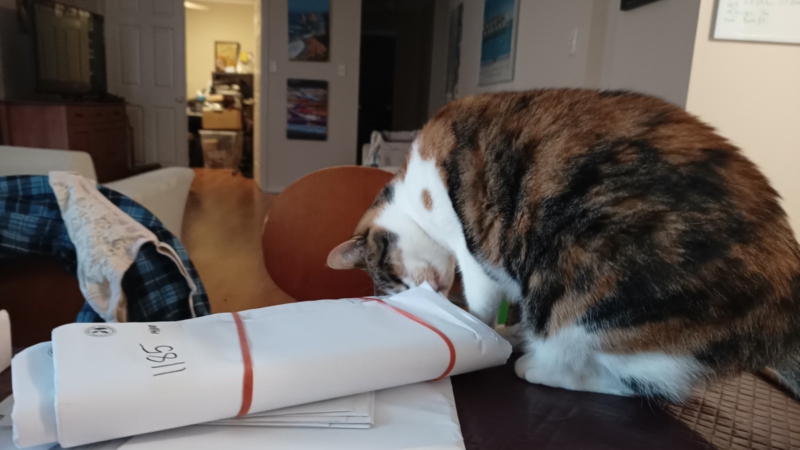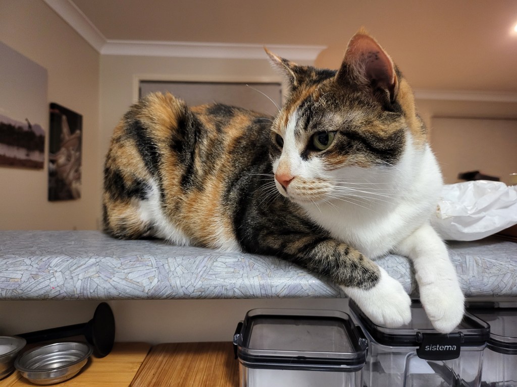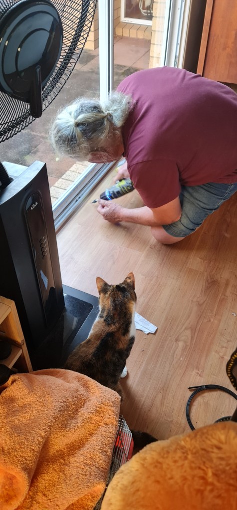 The Mummies have been keeping him very busy. There was a list of jobs they were talking about before he arrived and slowly but surely they are telling him which ones they want done, and he’s doing them. Some are very quick jobs – some are very involved and intricate, but probably the biggest job of all is him enclosing the back deck – and we are all going to love that because when it’s done I’m going to be able to go out there by myself. I’m hoping M Kaz will even consider putting my litter tray out there because I am a little shy and I don’t like people walking in on me while I am in my tray. M Kaz is so bad some times that even before I’m done covering “stuff” up, she has me out of the tray and is cleaning it out for me – beats me why she thinks it doesn’t take a good couple of minutes of scratching in the tray and on the side of the bathtub and on the bathroom floor to get the job done.