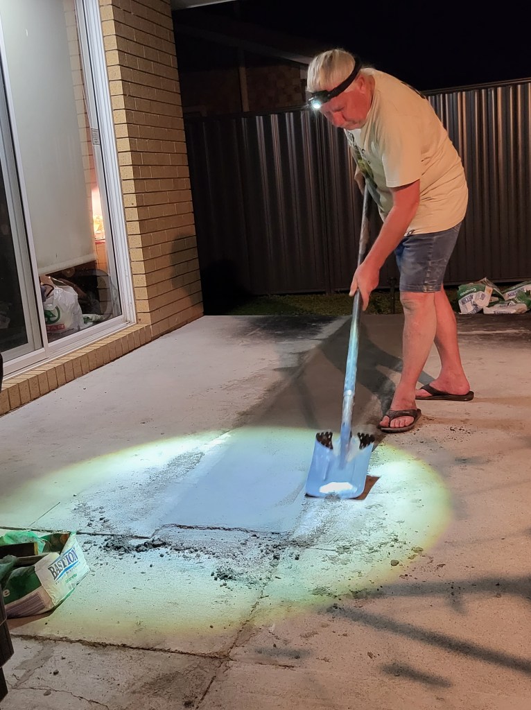 While Uncle Wayne has been doing his “jobs” I have been watching him as best I can – I want to learn about doing building stuff as well. It’s hard though when I have to watch it from the bathroom window — it’s hard to be able to see enough – but I was able to have a Nigey-eye view of him finishing off the cementing on the back deck the other night. He must have been determined to finish because it was dark and he was lighting up what he was doing with a torch … ON HIS HEAD! He had his head torch back on again this evening when he was fixing up the very bad job someone had done on the screen door in the living room – you can see this has never worked properly he said as he continued to try to fix it – which meant he first had to get the door off and that seemed to be a massive job. He hasn’t quite finished it tonight – he thinks he will do another half-hour or so on it tomorrow to “drop it 10mm and make it schmick”. I have a lot to learn about building!