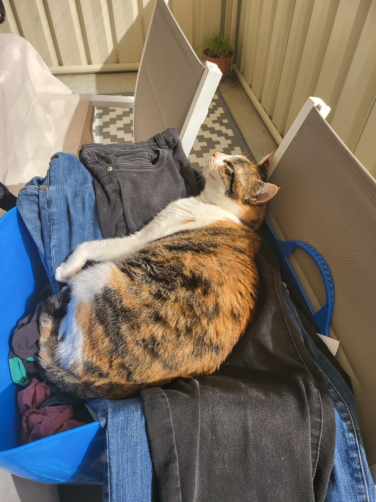 I’m currently getting it Outback – where the lovely Mummies (not ‘those Mothers’) have left the washing out there in a tub or on the table, so I can just snuggle in there and have my naps in the sun. It’s actually very comfortable – and the dryer is even better. Yes, M Kaz is always very careful to check I’m not in there before she throws the washing (or is that drying?) in. I have it on good authority that she also checks the dishwasher before she runs that, too, just to make sure I’m not checking that out from the inside. The washing and drying (and not going outside) and my excellent grooming habits explain why I am so white in my white bits!