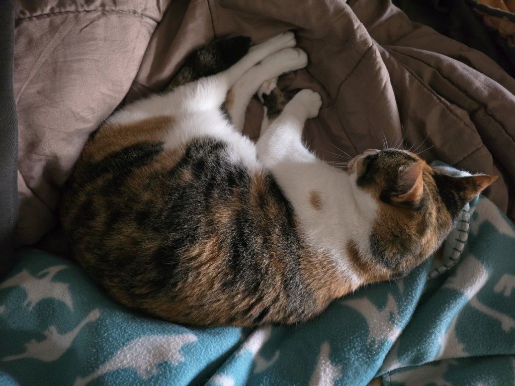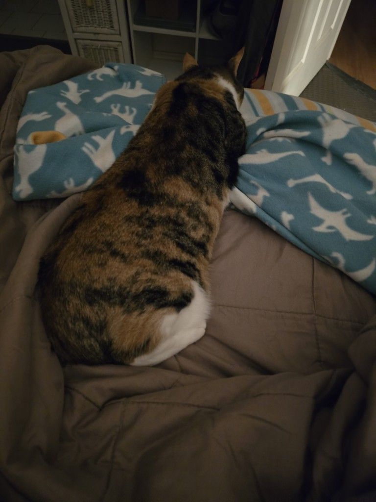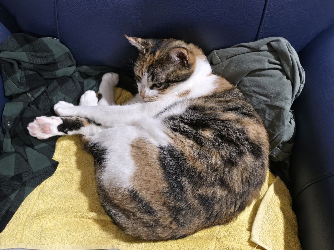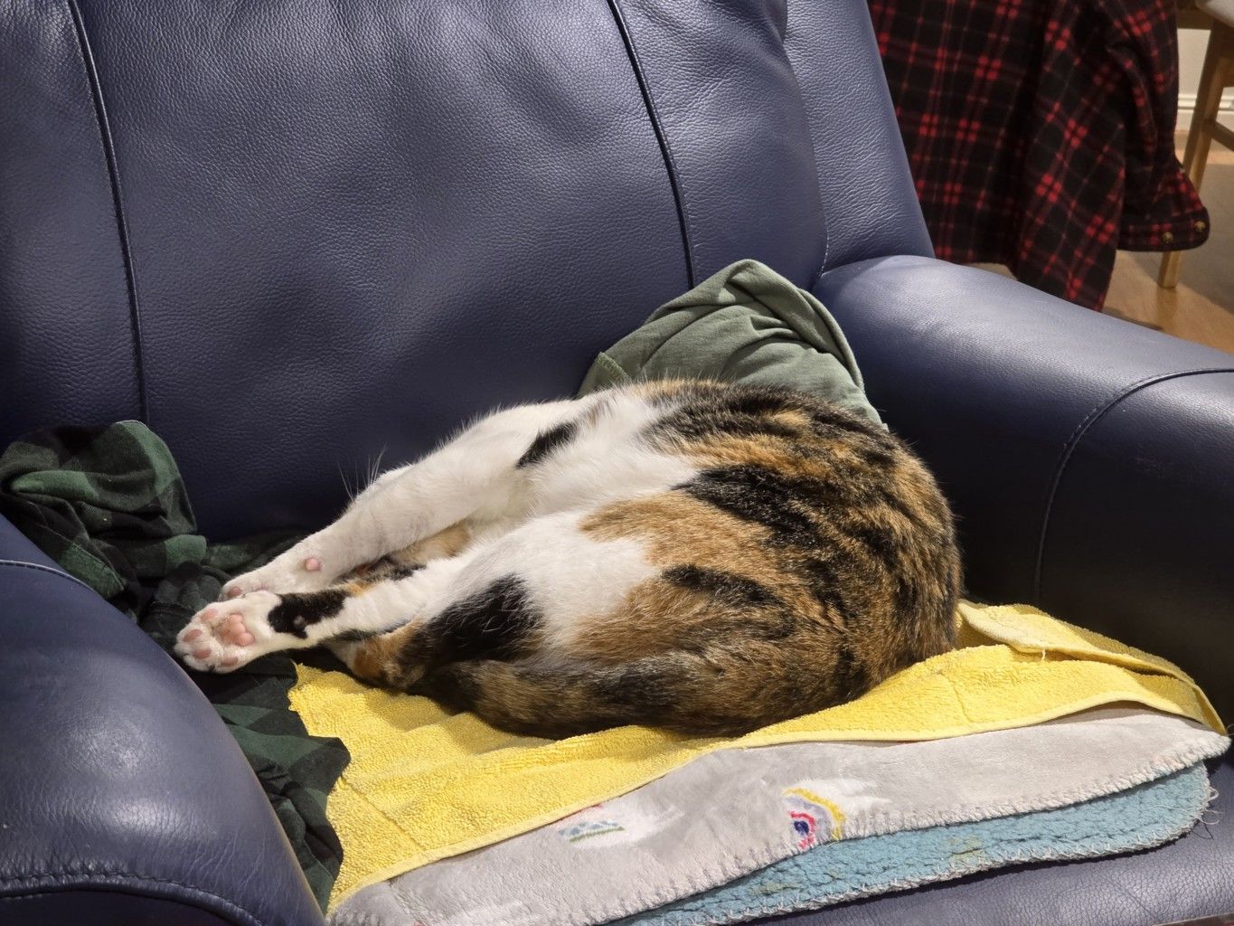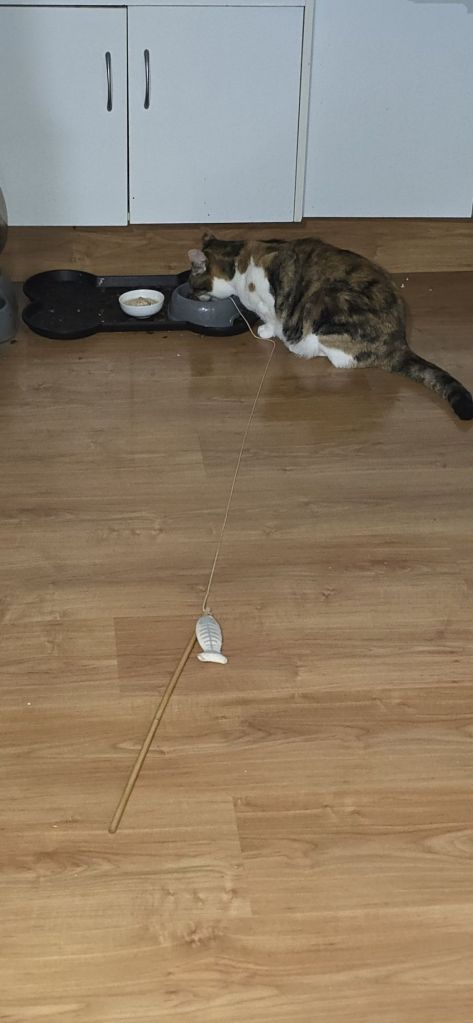 The only good thing is that at the V-E-T’s, there was no thermometer – just a weigh-in (I’m maintaining my weight), a gum and tooth check (all good), tummy probe (no lumps or bumps to worry about), heart murmur listen (no change), a vaccination and a nail clip. I gave M Kaz the silent treatment on the way home – and once we arrived home, but I took pity on her a while later and went and put my head on her foot as she sat on the side of the bed playing her casino game.