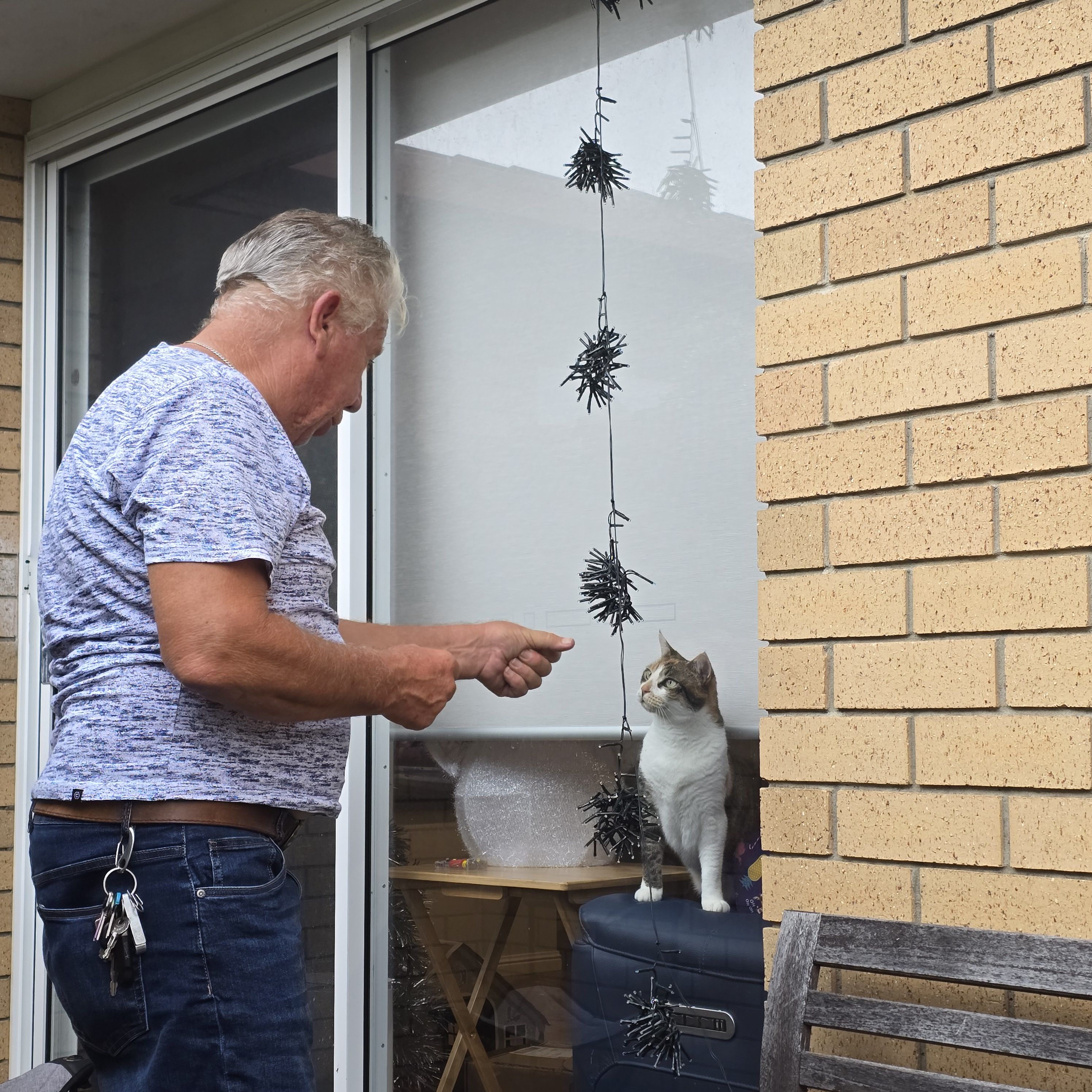 It is beginning to look a lot like Christmas around here! Uncle Wayne has been visiting and the Mummies have had him doing jobs around the place again. This time they had him putting up the solar Christmas lights. The most amazing thing about that is that they still work – given the ones they had him put up have been sitting in the drawers near the front door since I arrived here five years ago! M Kaz is not one to rush things. And Christmas light fixing technology has come a long way since then – with little sticky things now available that will adhere to most surfaces to allow the fixing of the lights.