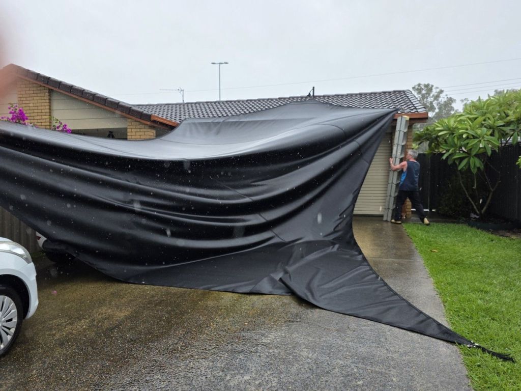 It’s still raining and it has been a bit on the windy side: there were 100km/hour winds overnight and you could hear that it was a bit blowy outside. There are some trees down in Labrador and over the Gold Coast generally and this morning, to be on the safe side, Steve from out the front suggested pulling the shade sail over the driveway down because it was sagging badly (almost resting on the cars). It was a good idea, especially since it already appeared to be storm-damaged. Better to take it down rather than have the baton secured to the roof torn out. On the other hand, that could flood the garage and M Kaz would have to toss EVERYTHING out rather than angsting (which she does) about what to keep.
