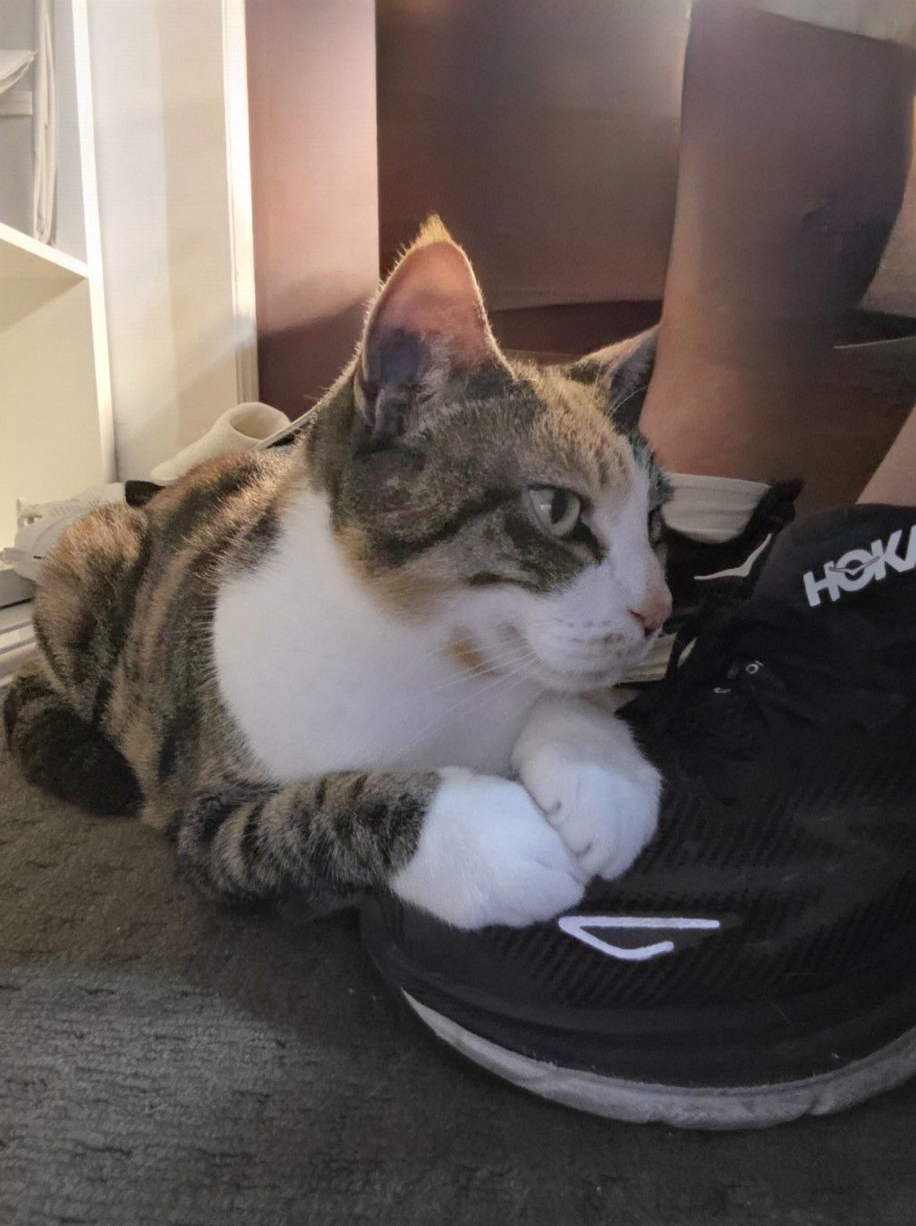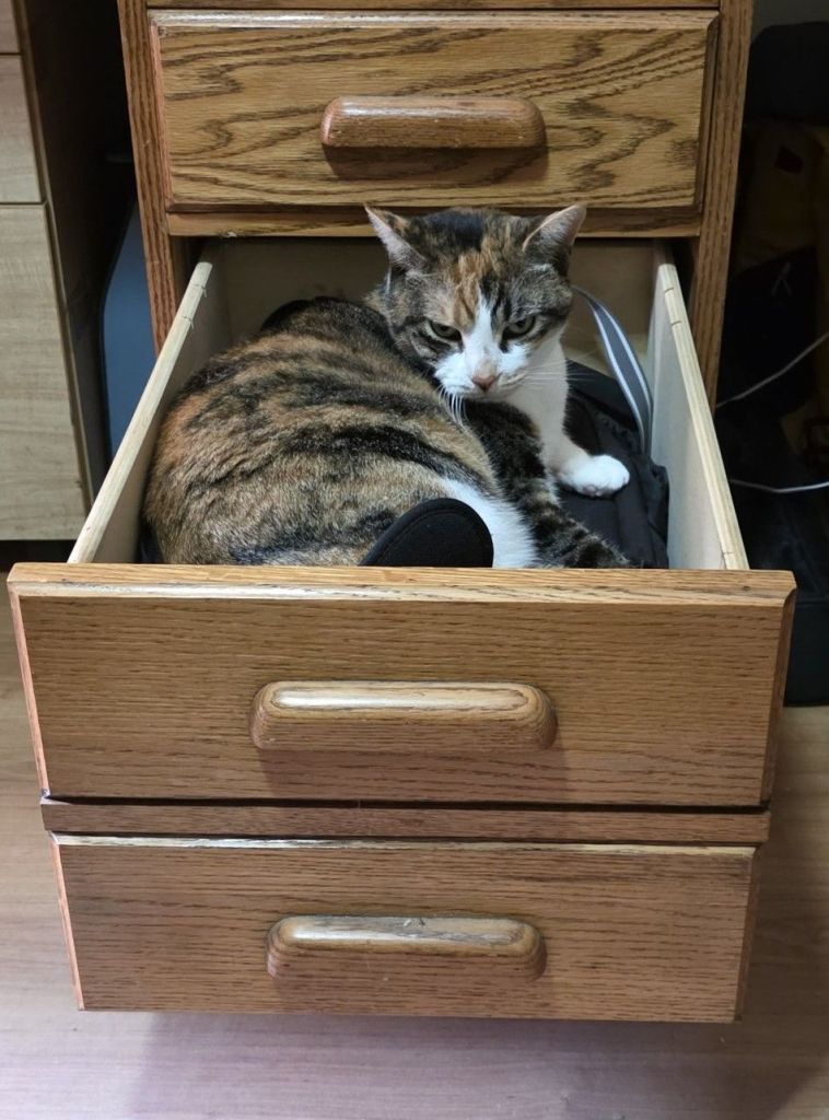 It was Sunday, M Kaz. Sunday! You’re not supposed to lock yourself in your office on a Sunday. It’s the weekend when you devote yourself entirely to me and not to yucky work – especially not the kind where you think you have to lock me out of the office so I don’t take up residence on your foot and the typing pedal. Yes, I know you offer me the drawer for while I’m in there with you, but that doesn’t always suit me. So what was so important that you had to do it on the weekend? Some court case transcription that you’d promised them back for Monday morning? And you couldn’t have done it at any time on Thursday and Friday when it was first assigned to you? Hmmm. Not happy M Kaz.