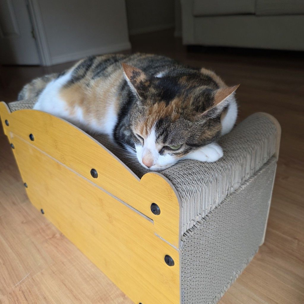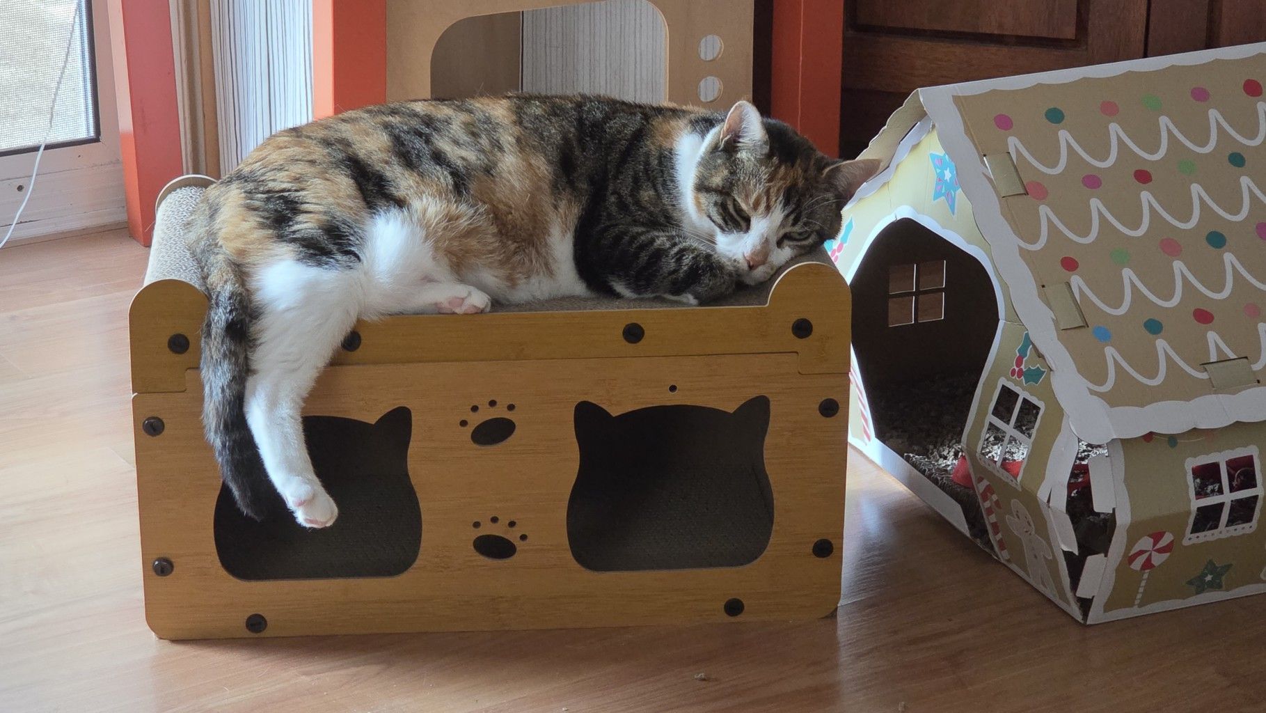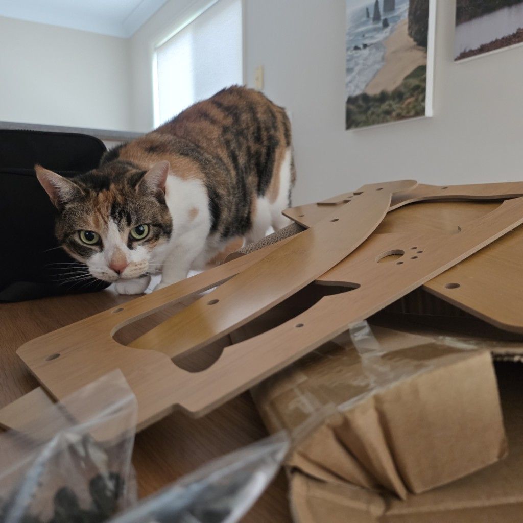 Of course I knew the box that arrived from Temu was for me, M Kaz. That’s why I jumped on it as soon as it came inside – and why I wanted to help you put it together for me. You really are a bit slow with putting things together, M Kaz, but at least you did a better job on this one than you did on the gingerbread house that Aunty M got for me a couple of years ago. I’m not saying that your construction methods have anything to do with it (heh heh) but it is looking a bit the worse for wear these days and we know (because of the pitched roof) that I didn’t sit on it! Yes, yes, we all know that I was responsible for crashing the Christmas caravan but that was a couple of years ago now M Kaz so it’s time you let that go.
