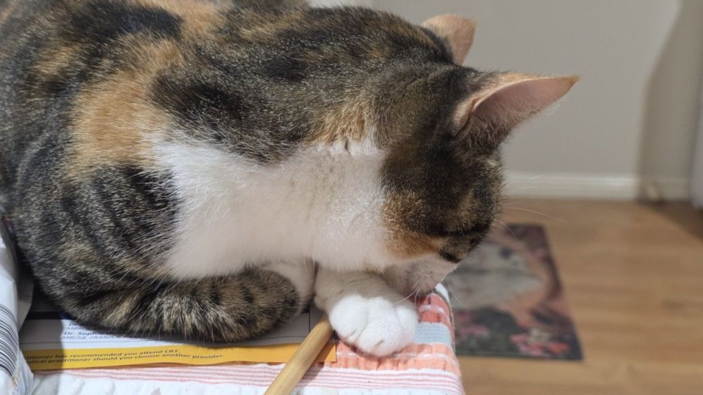 The newly-planted … can you call it ‘planted’ if it’s being grown hydroponically? – cat grass is coming along nicely. I keep reminding M Kaz to check that there’s still water in the container under it – because we know she didn’t keep it topped up last time and that’s why there’s ‘newly-planted’ Nigey grass. She seems to be doing okay with it and she’s aso giving it regular squishes of water from the squishy-bottle that Aunty M gave us. And thanks to Aunty M I have a new supply of my teeth cookies. I love me those teeth cookies.